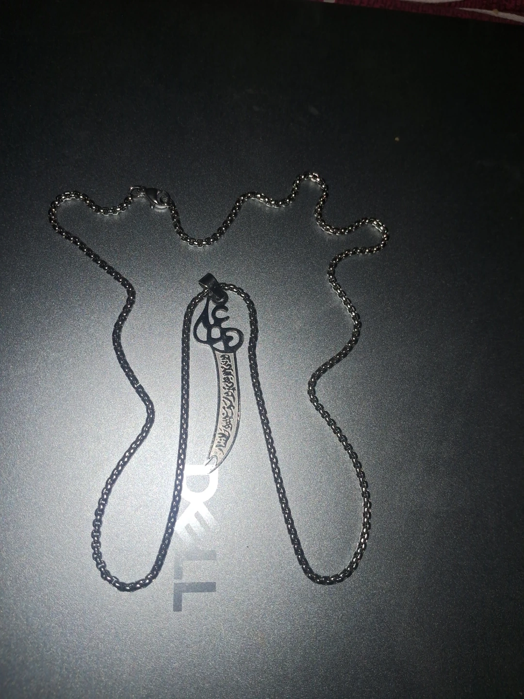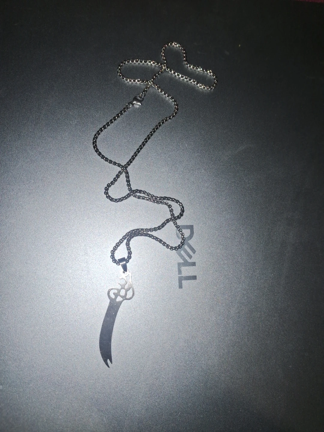 Selling a Zulfiqar sword pendant necklace. The pendant has some writing on it. The chain is silver in color. Pick up only cash only