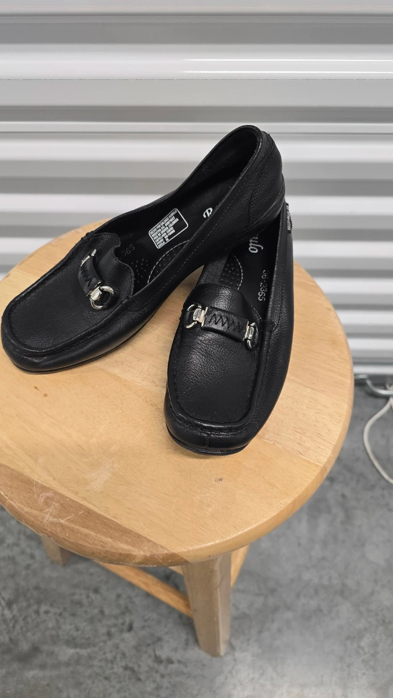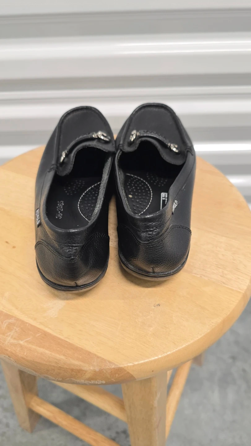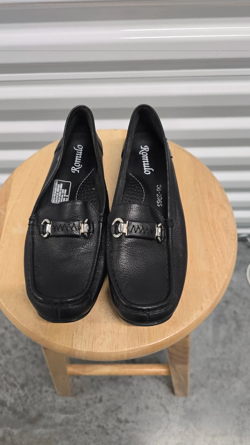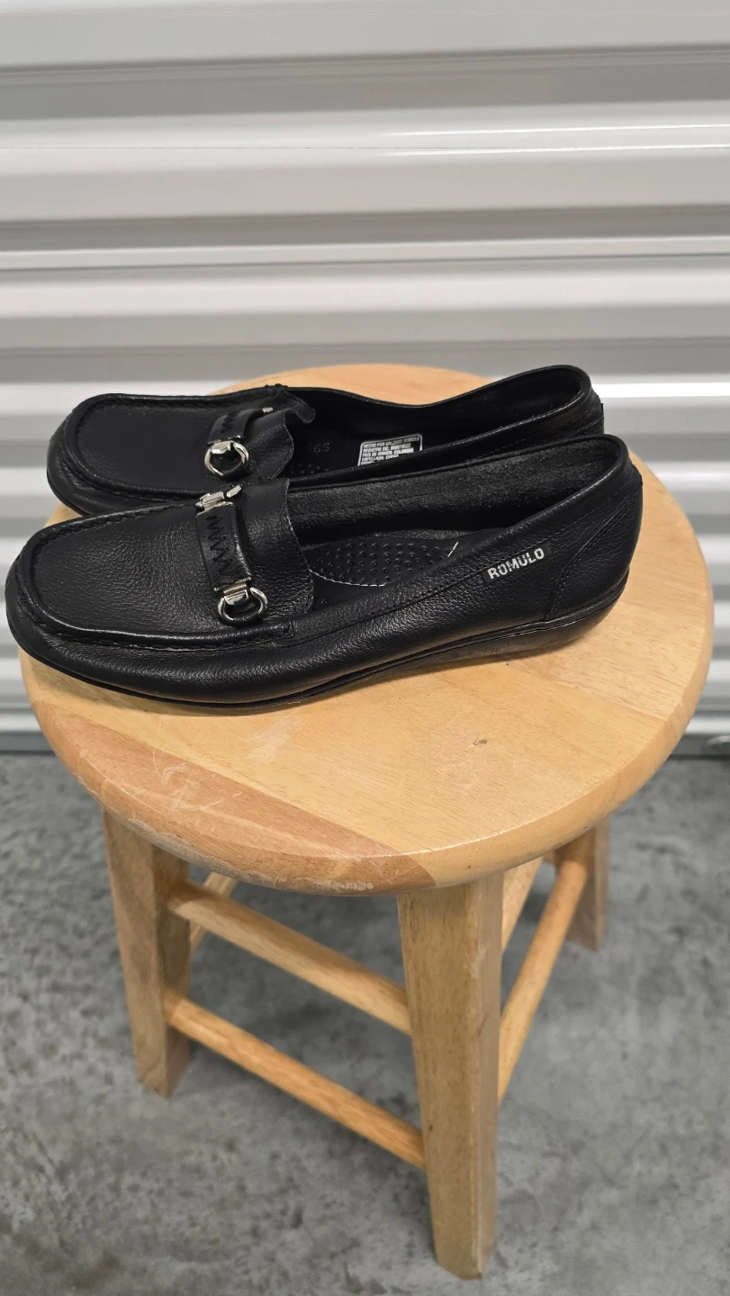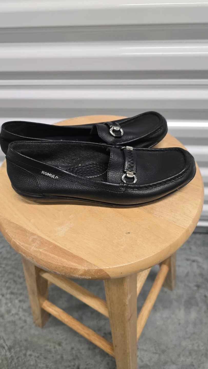 Selling a pair of Romulo black leather loafers. They feature a silver-tone embellishment on the upper. These loafers are in good condition and ready for a new owner