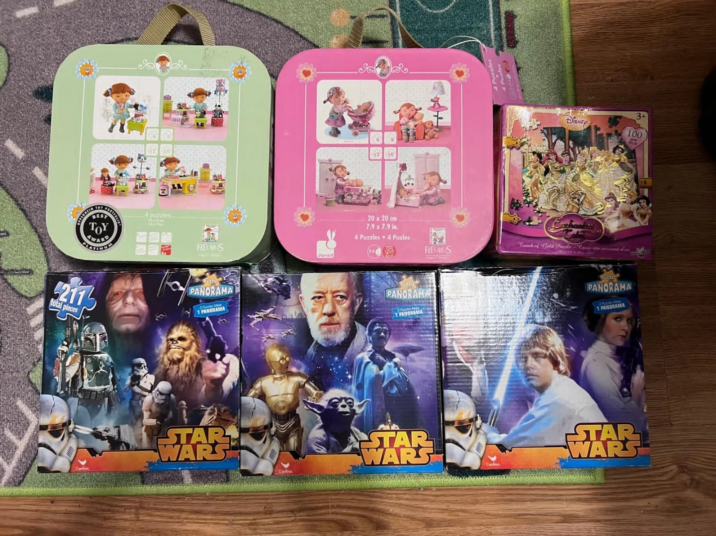 Selling a collection of kids' puzzles! There's a FleurUS puzzle set, a Janod puzzle set, a Disney 'Touch of Gold' puzzle (100 pieces), and three Star Wars panorama puzzles (211 pieces each)