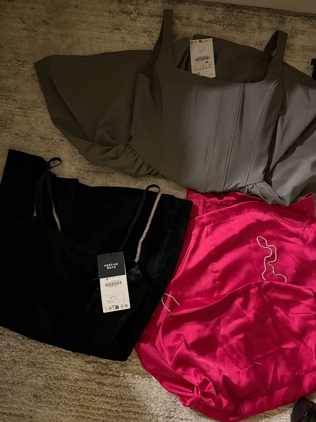 Selling three dresses from Zara! There's a bright pink mini dress, a black velvet mini dress with rhinestone straps, and a grey corset-style dress. All new with tags on Size Xs/s! three for $60