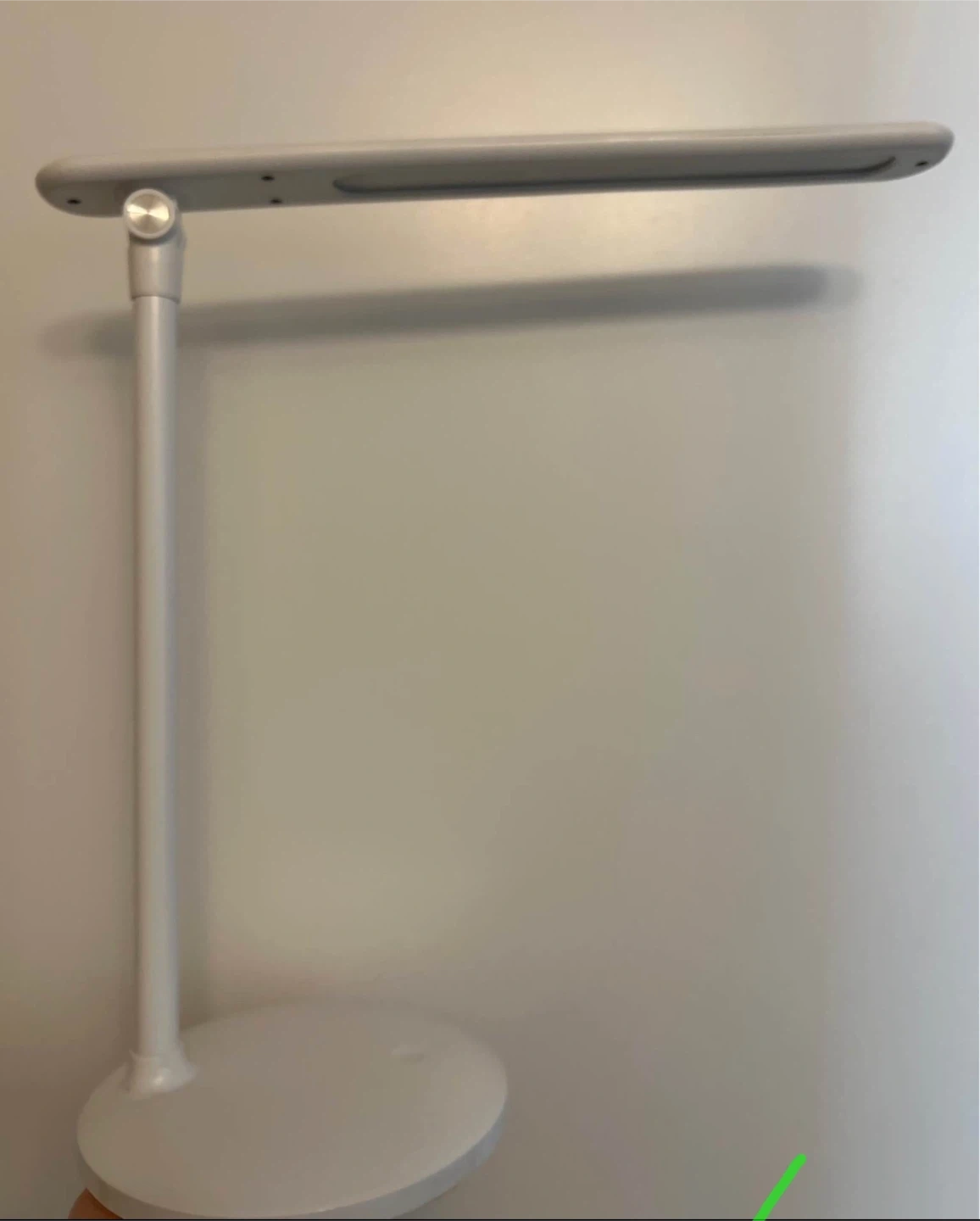 Selling a dimmable LED desk lamp in white! It's perfect for a desk, study, or bedside table. It's rechargeable and has a USB port. The lamp folds for easy storage and portability. It measures 335mm wide, 369mm high, and has a 150mm base