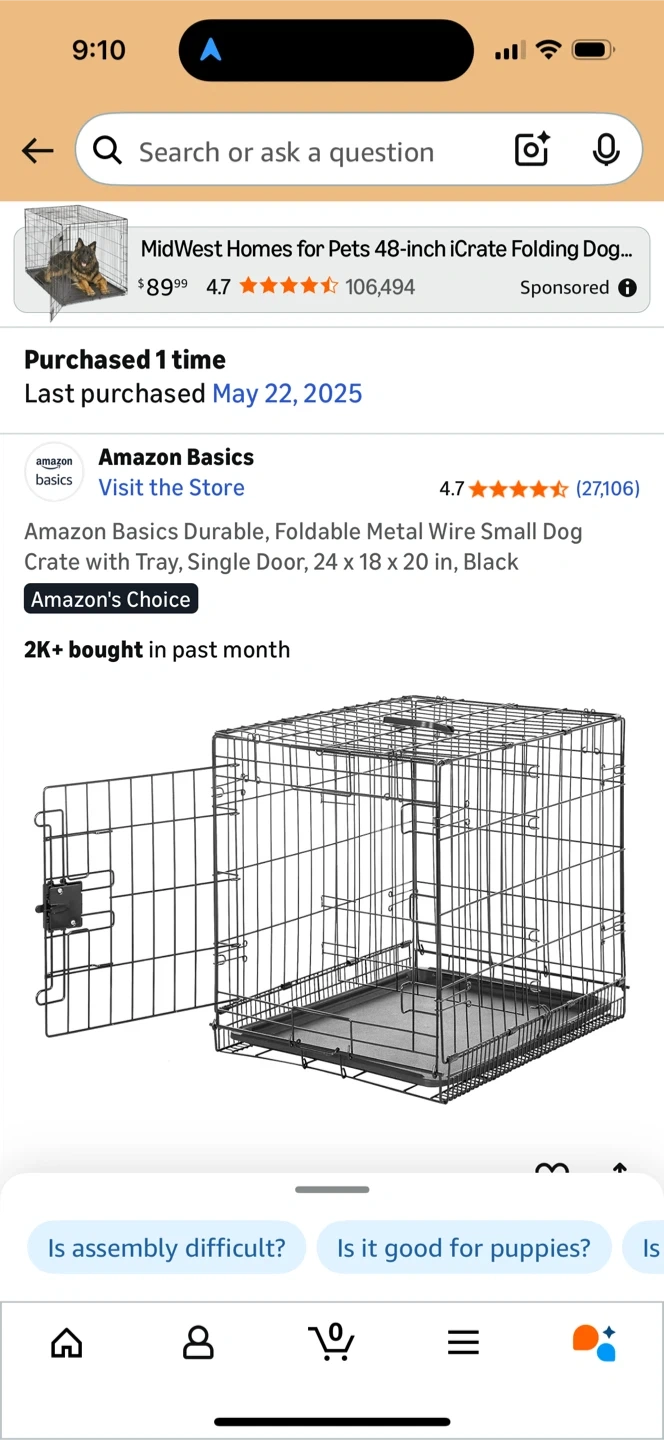 Selling a small, durable, and foldable metal wire dog crate from Amazon Basics! It comes with a tray and a single door. The dimensions are 24 x 18 x 20 inches, and it's in black. Last purchased on 2025 May 22