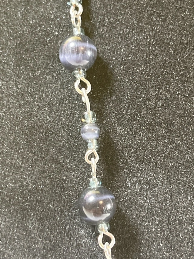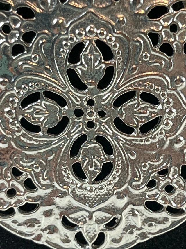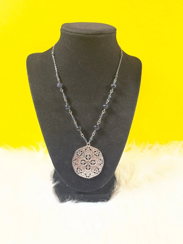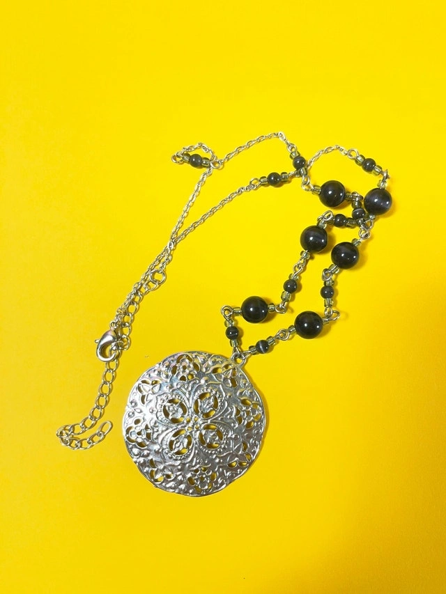 This item is a silver-tone filigree pendant necklace with black accent beads. The large, round pendant features intricate openwork detailing, often described as having a vintage or Art Deco style. The design likely uses glass or acrylic beads.