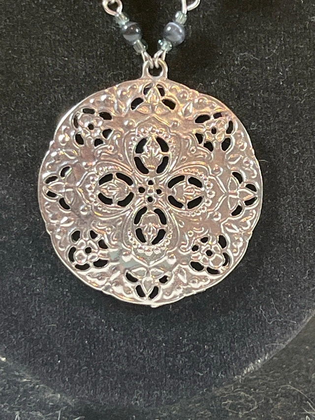 This item is a silver-tone filigree pendant necklace with black accent beads. The large, round pendant features intricate openwork detailing, often described as having a vintage or Art Deco style. The design likely uses glass or acrylic beads.