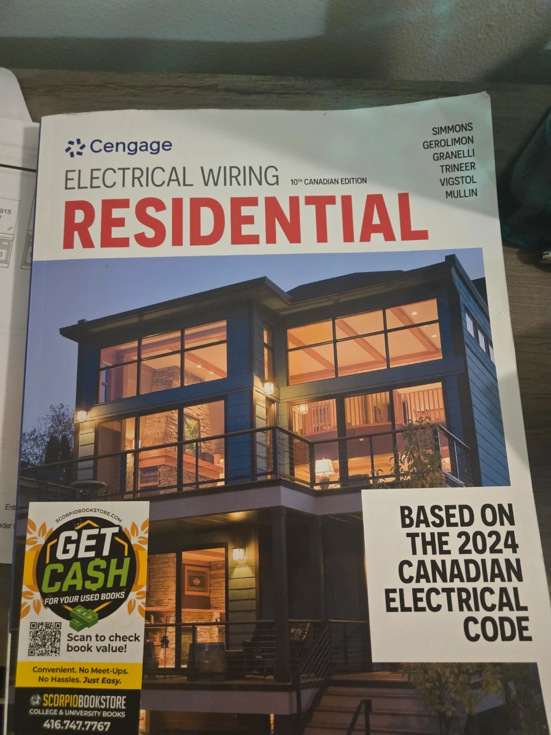 Selling a Cengage Electrical Wiring Residential textbook, 10th Canadian Edition! It's based on the 2024 Canadian Electrical Code. Dont need it anymore as its only used for level 1 trade school, but its a mandatory book so here's the hard copy if your teacher is a stickler.