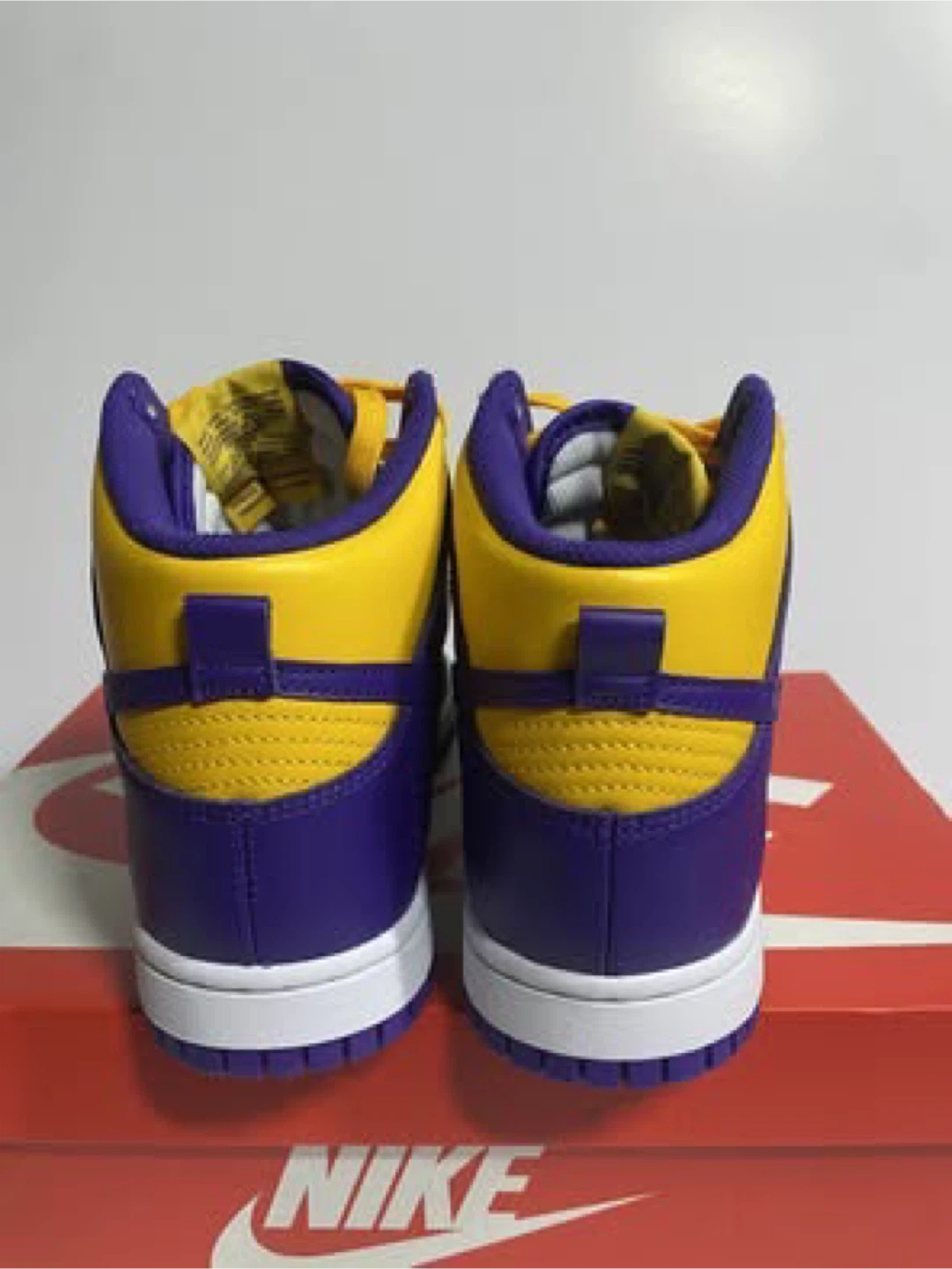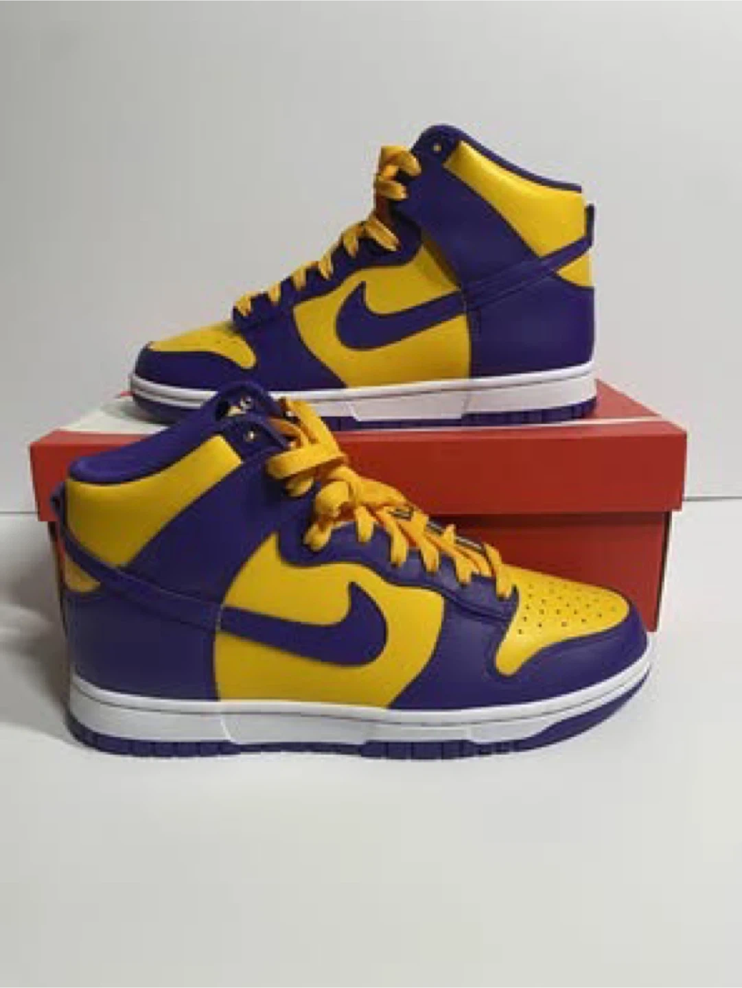 Selling a pair of Nike Dunk High shoes in the Lakers colourway (yellow and purple). These sneakers are in brand new condition and come with the original box.