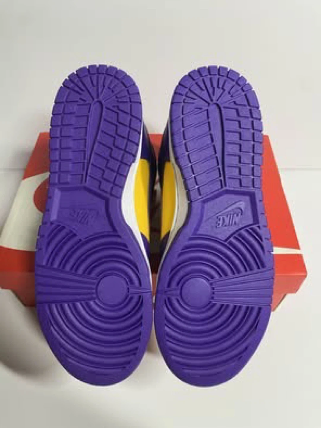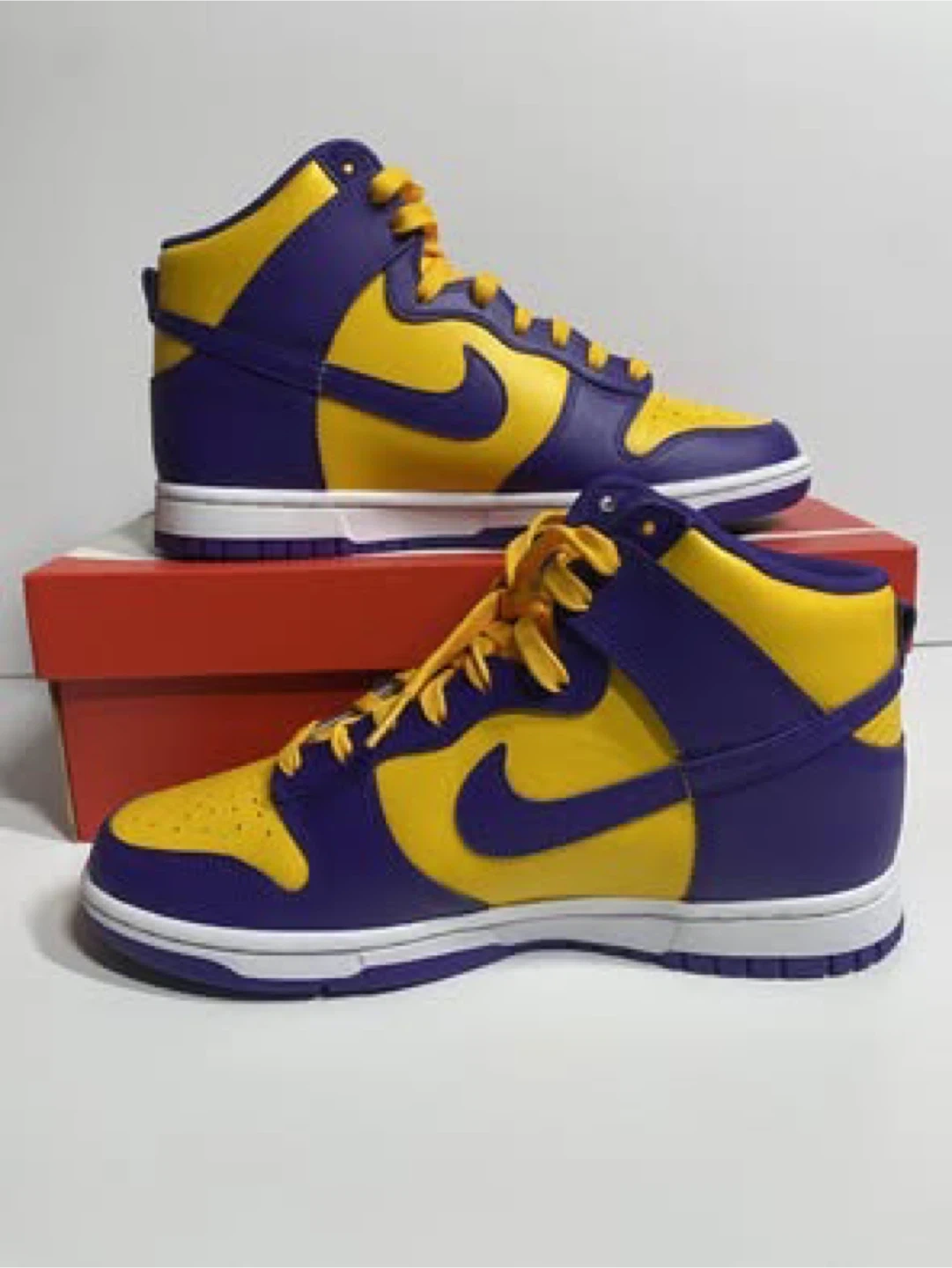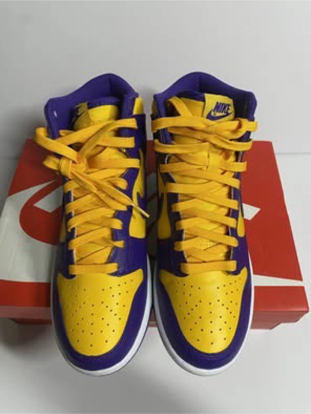 Selling a pair of Nike Dunk High shoes in the Lakers colourway (yellow and purple). These sneakers are in brand new condition and come with the original box.