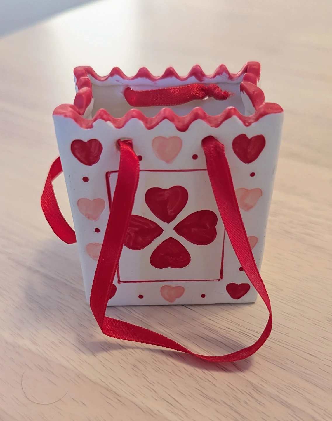 This cute ceramic bag features a lovely heart design and a red ribbon handle. Perfect for adding a touch of charm to any room! It's in great condition and ready to brighten up your space