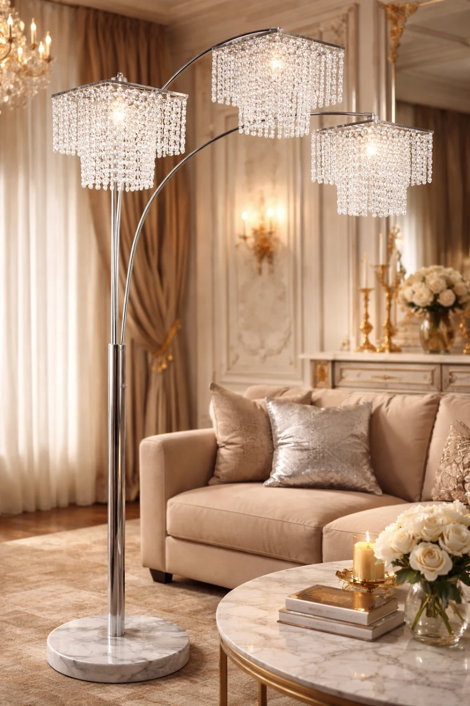 Add instant glamour and sophistication to your space with this stunning crystal arc floor lamp. Featuring three cascading crystal shades, a sleek chrome finish, and a solid marble base, this lamp creates a beautiful ambient glow while elevating any room.