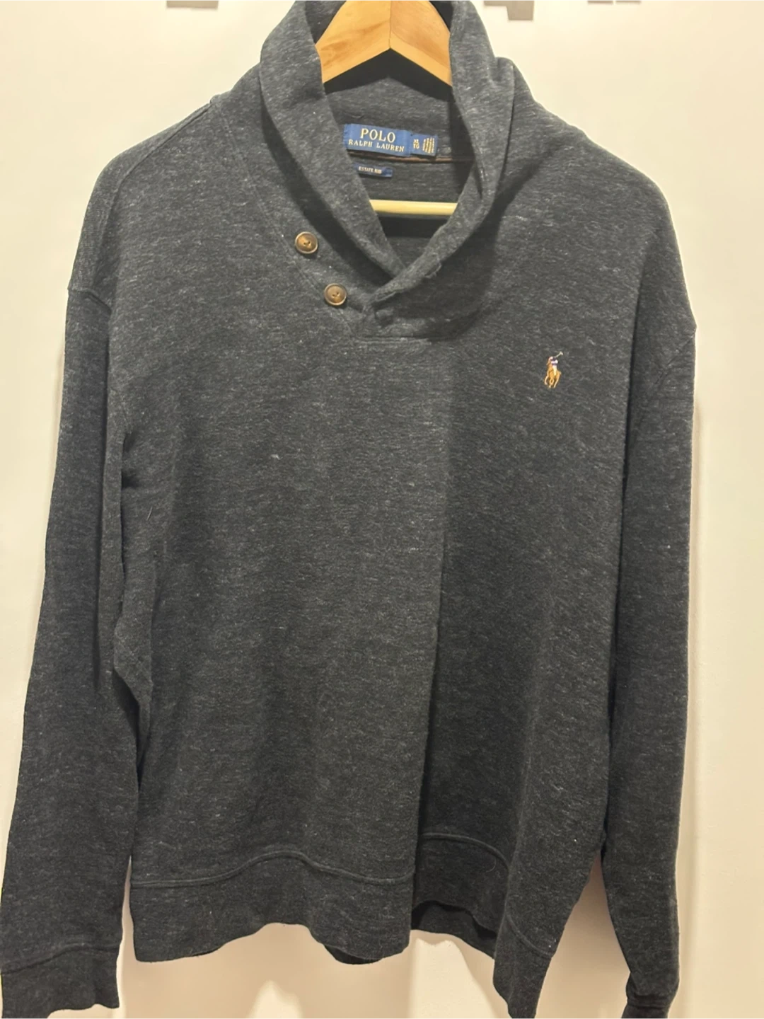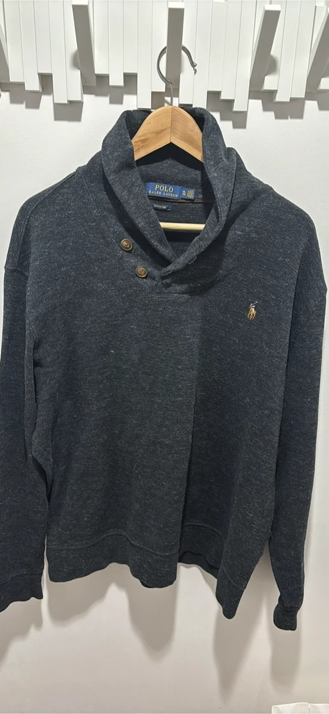 Selling a Polo Ralph Lauren pullover in size XL. It's a stylish grey colour with a unique button-up collar design and the classic Polo logo. Great for layering or wearing on its own!