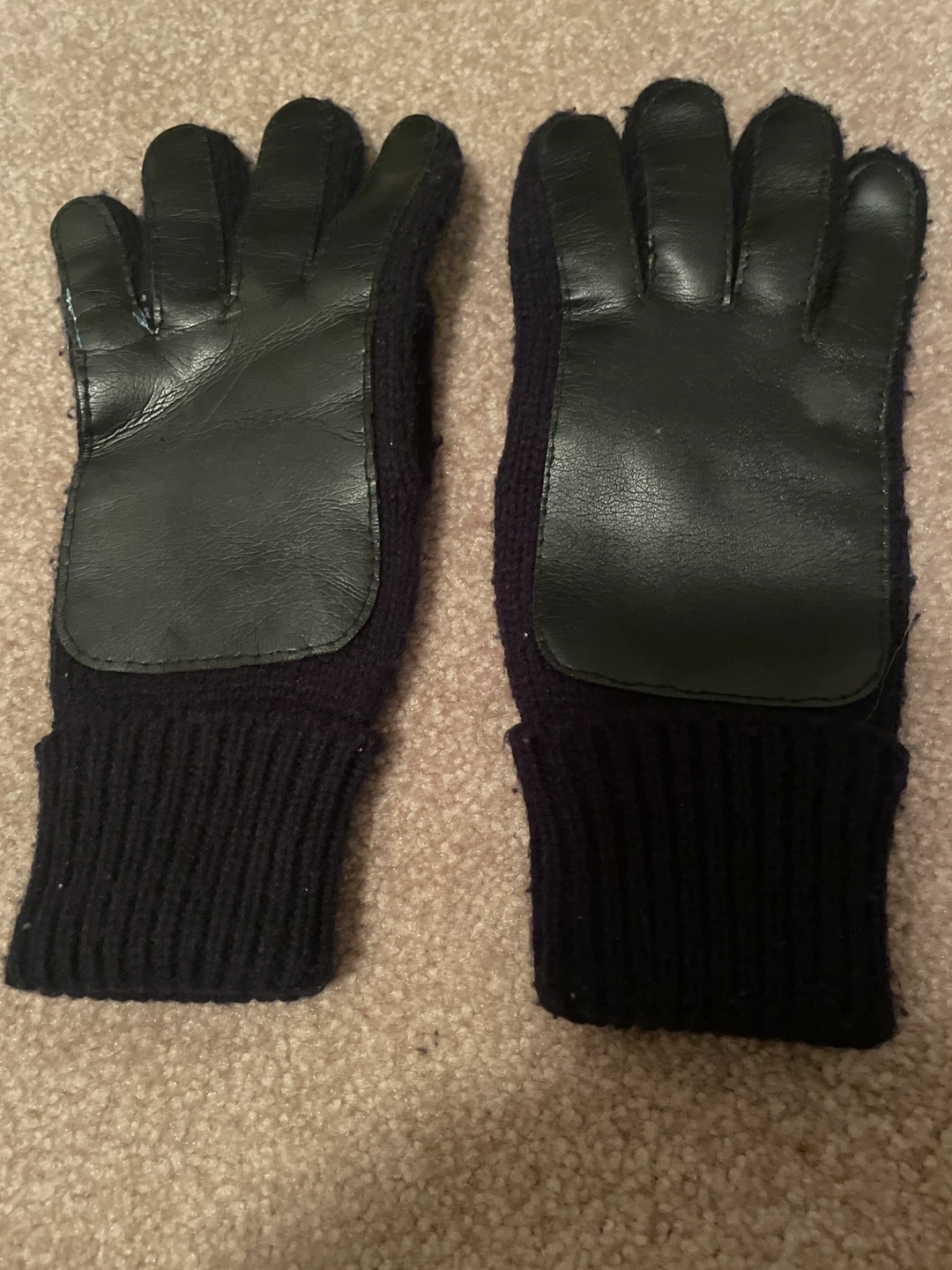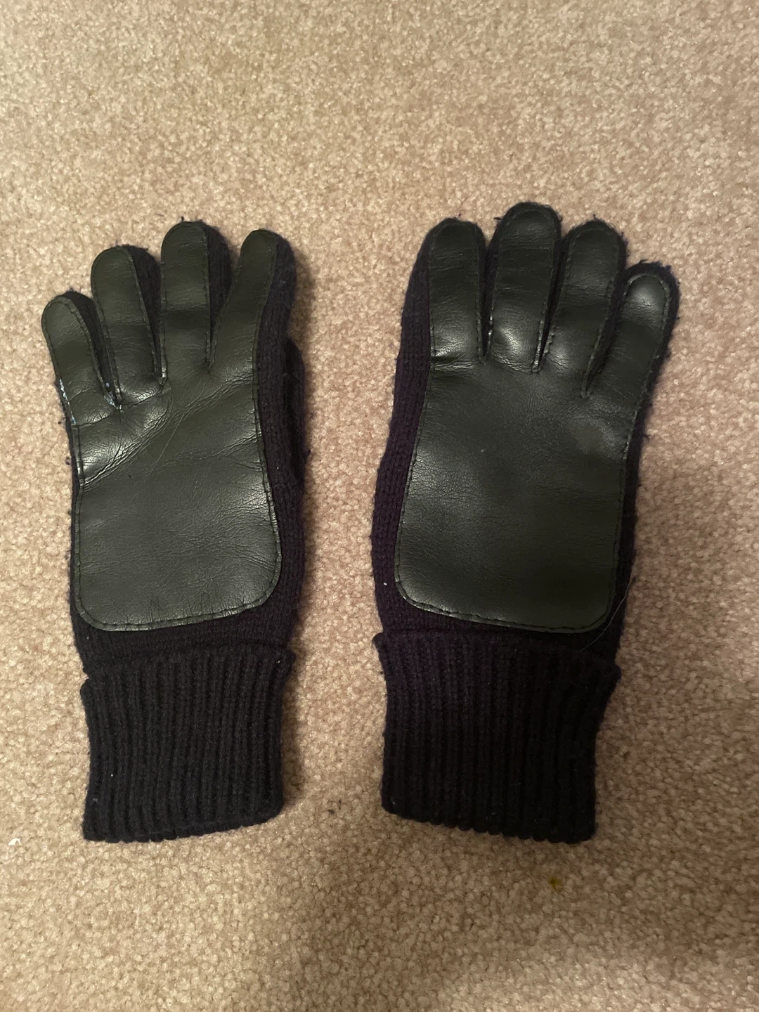 Selling a pair of gloves that feature a black faux leather palm and a knitted wrist. They're in great shape and ready to keep your hands warm!