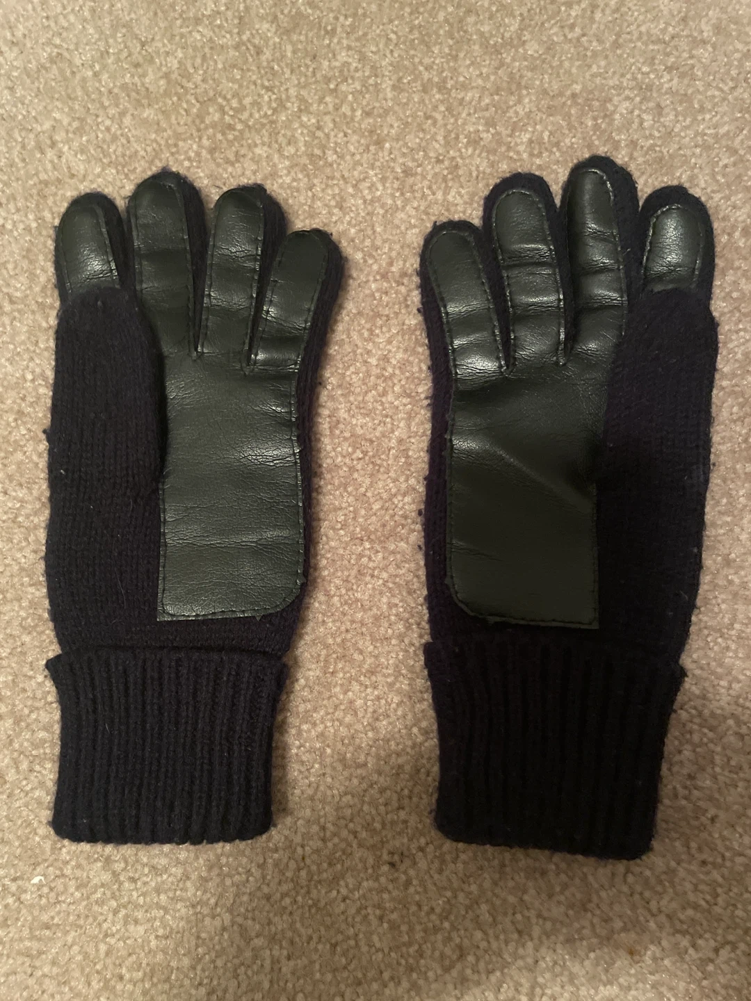 Selling a pair of gloves that feature a black faux leather palm and a knitted wrist. They're in great shape and ready to keep your hands warm!