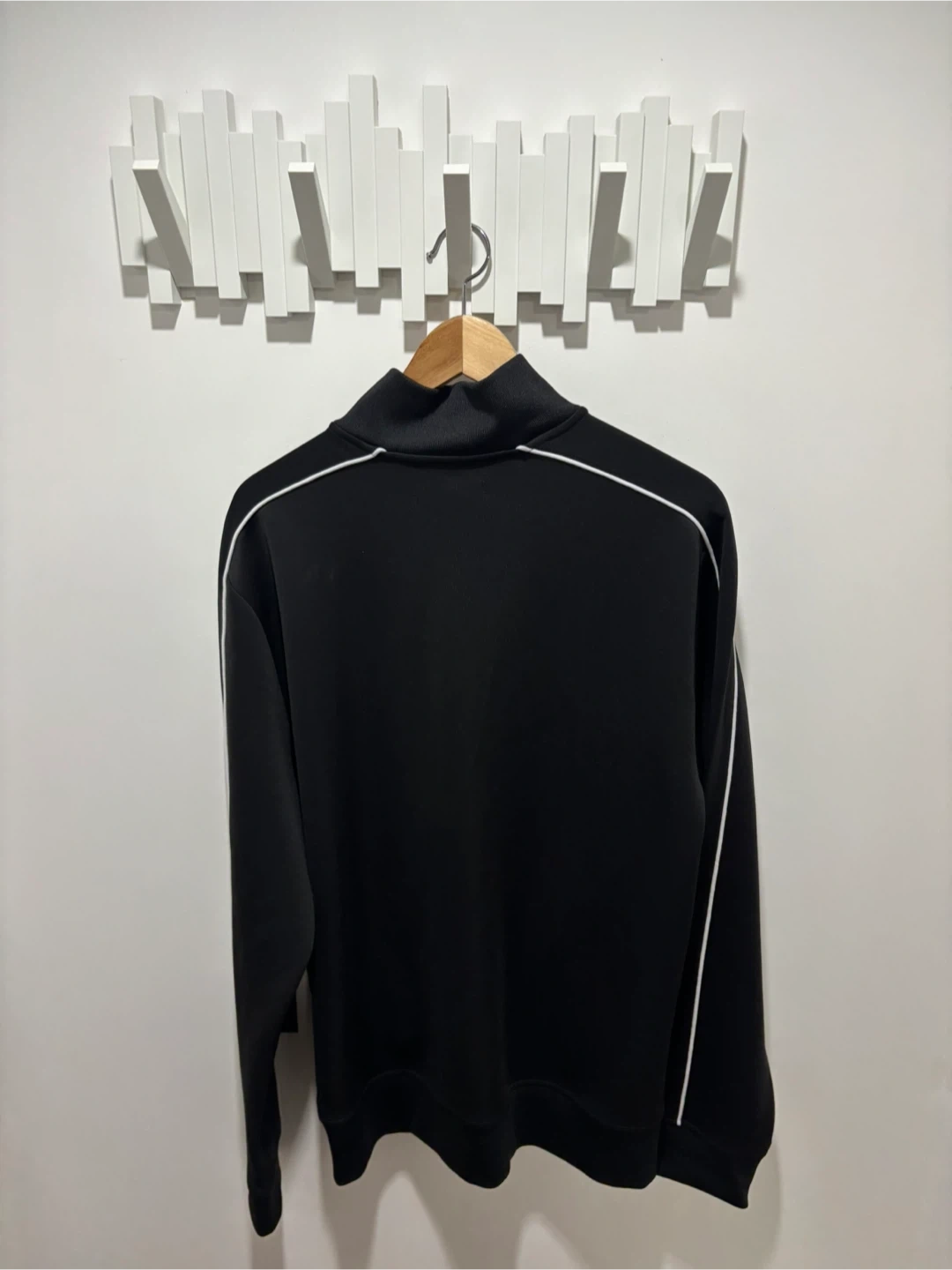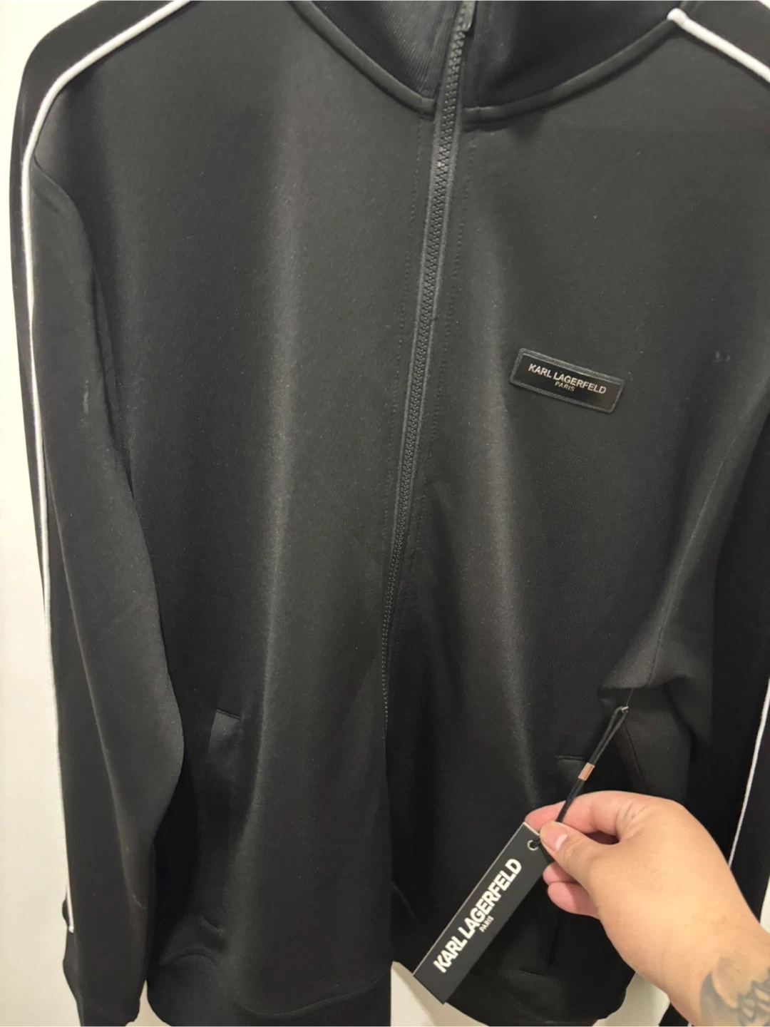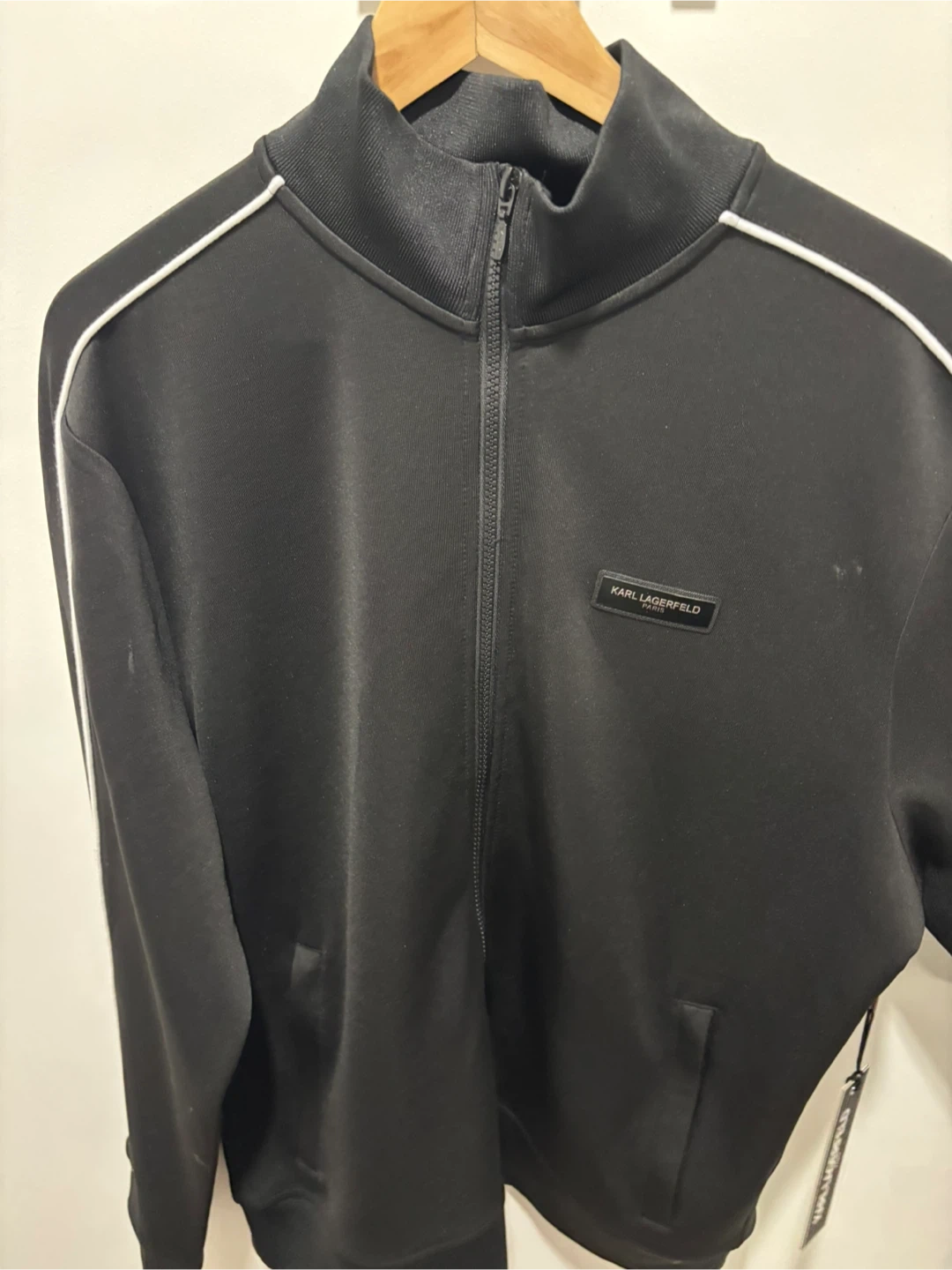 Selling a Karl Lagerfeld track jacket in black! It's a stylish and comfortable piece that's perfect for layering or wearing on its own. The jacket features a full zip front and subtle branding for a sleek look