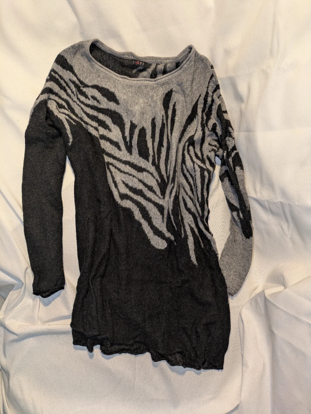 1. Asymmetrical grey and black knit - Cyrus, rayon/nylon (well loved)