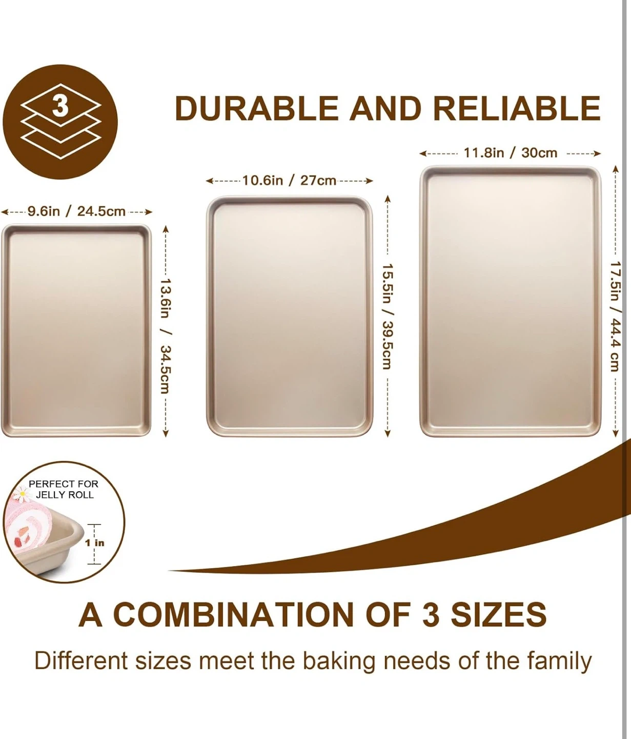 • Product Features: Includes three sizes of baking sheets: small, jelly roll, and half sheet. Features a premium nonstick coating, chemical-free, and fully rimmed border.