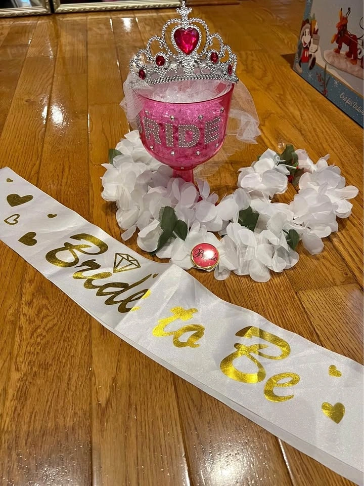 Large glamours hot pink bride cup with matching crown and veil also comes with bride pin bride sash and white flower leia necklace -New Never used $15