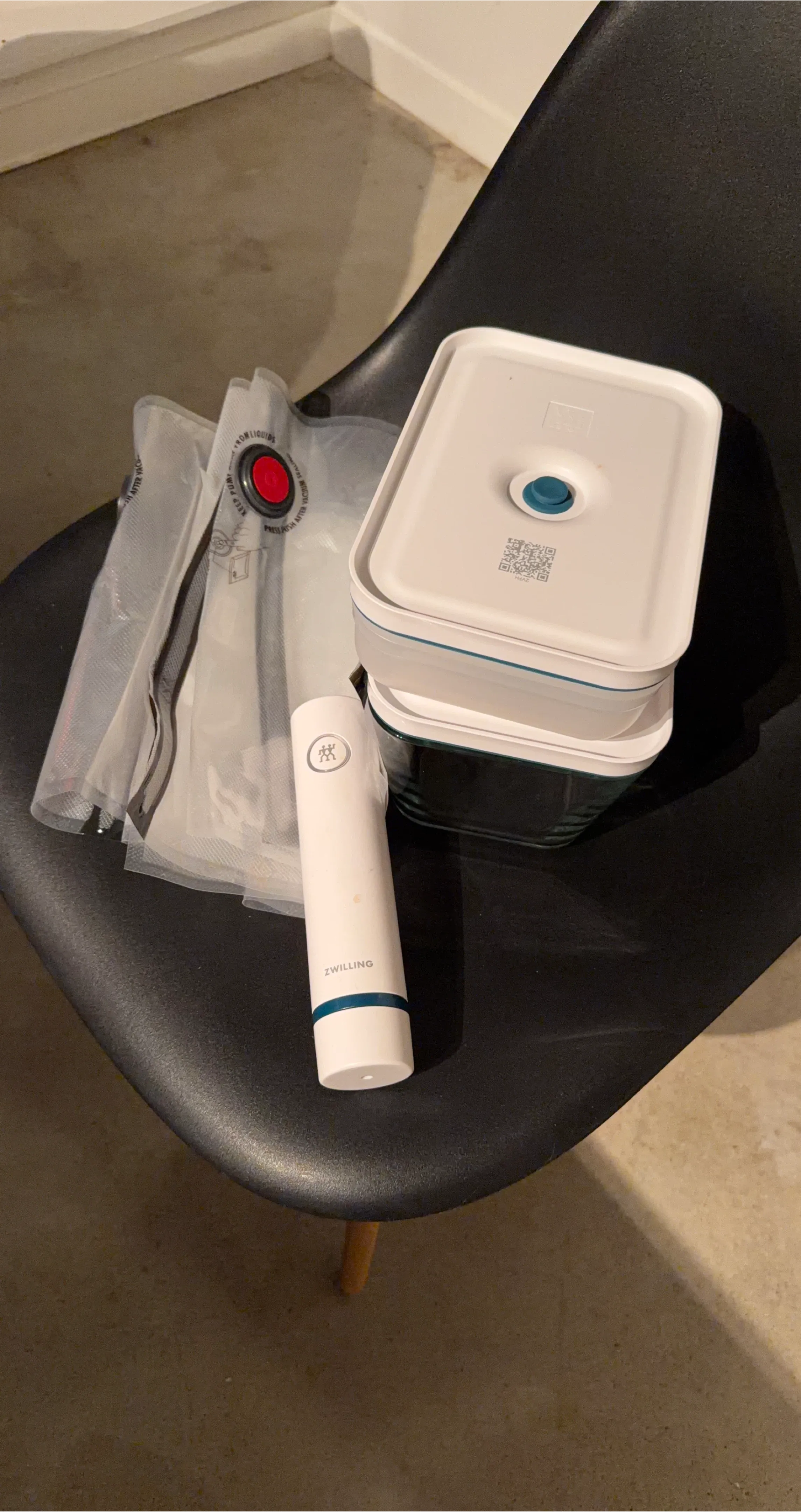 Selling a Zwilling Fresh & Save vacuum starter set. It includes the vacuum pump, containers, and bags. The vacuum pump helps keep food fresh longer. Perfect for meal prepping and storing leftovers!