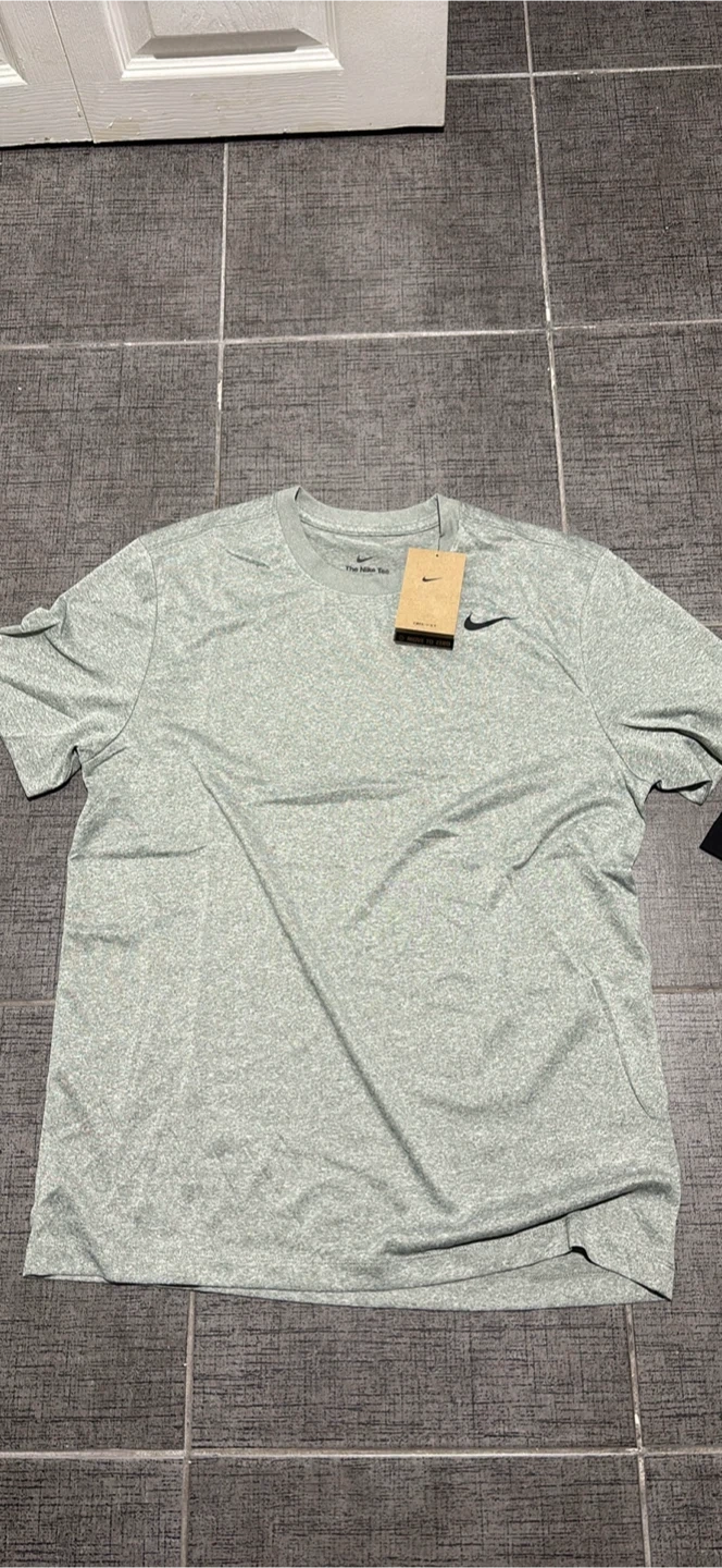 Here's a Nike Dri-FIT T-Shirt in grey! It's in great condition and ready for your next workout or casual outing. The Dri-FIT technology will help keep you cool and comfortable.