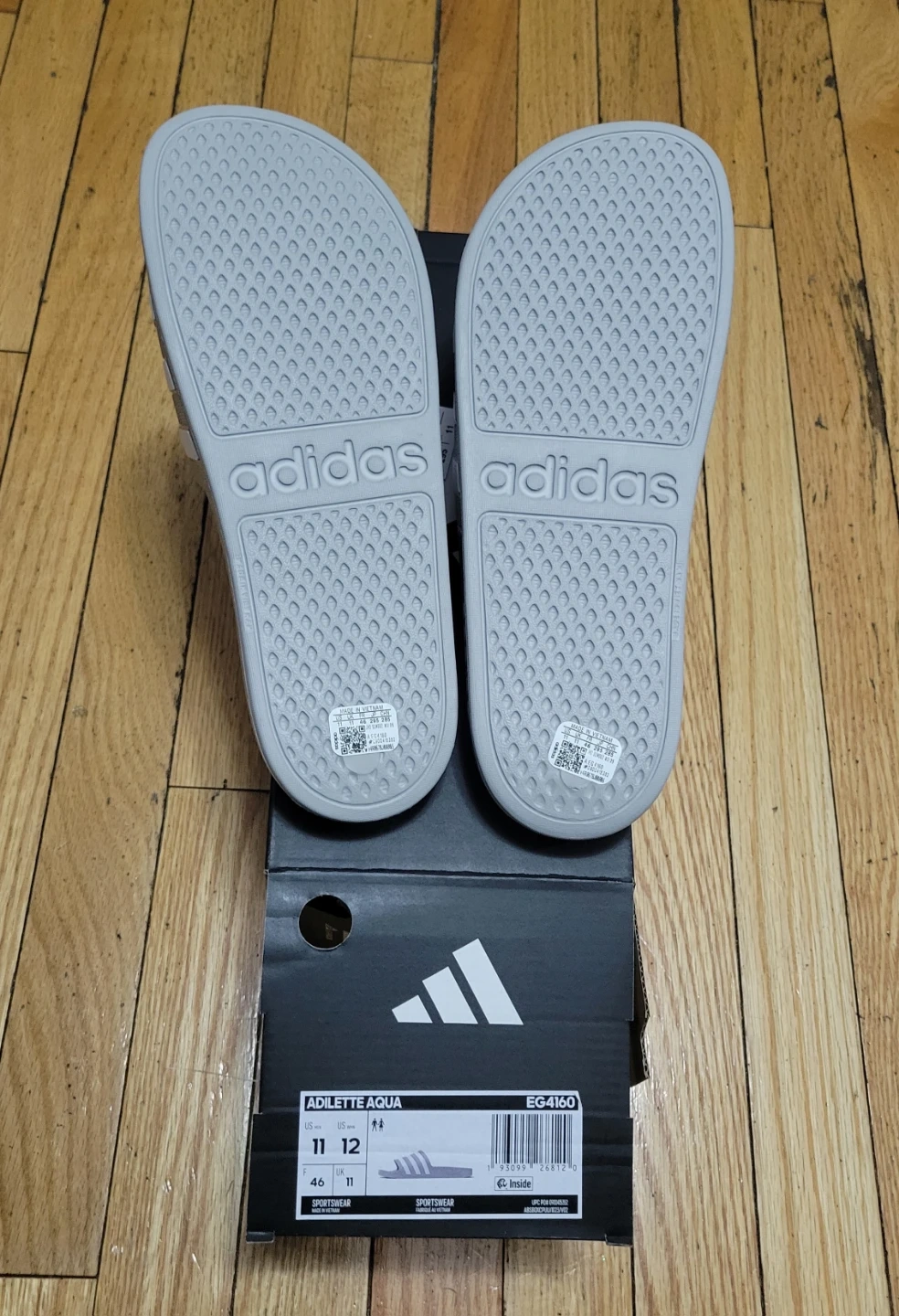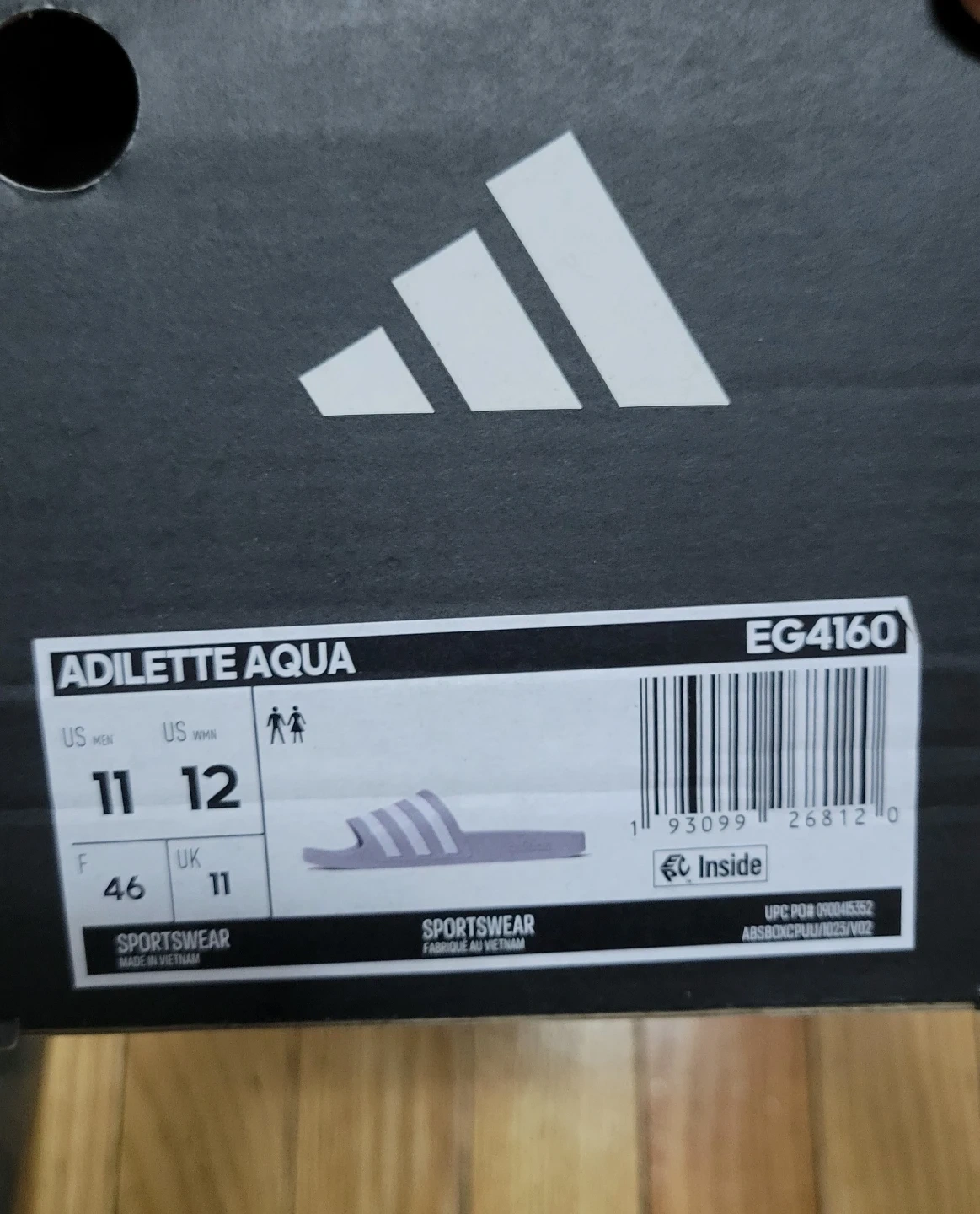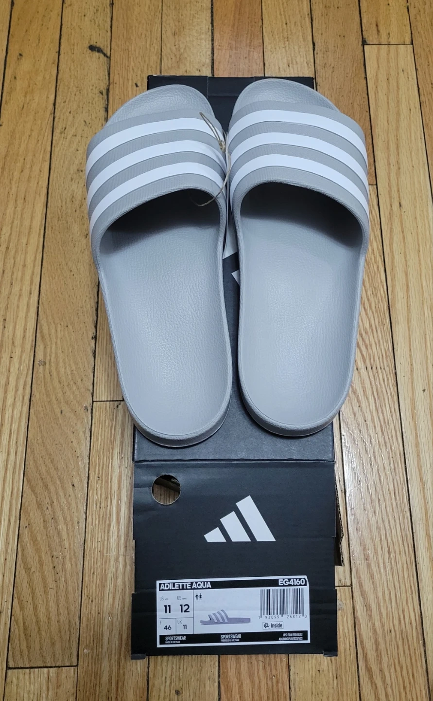 Selling a pair of Adidas Adilette Aqua slides in US men's size 11! They are a light gray color with the classic three stripes. The box is included!