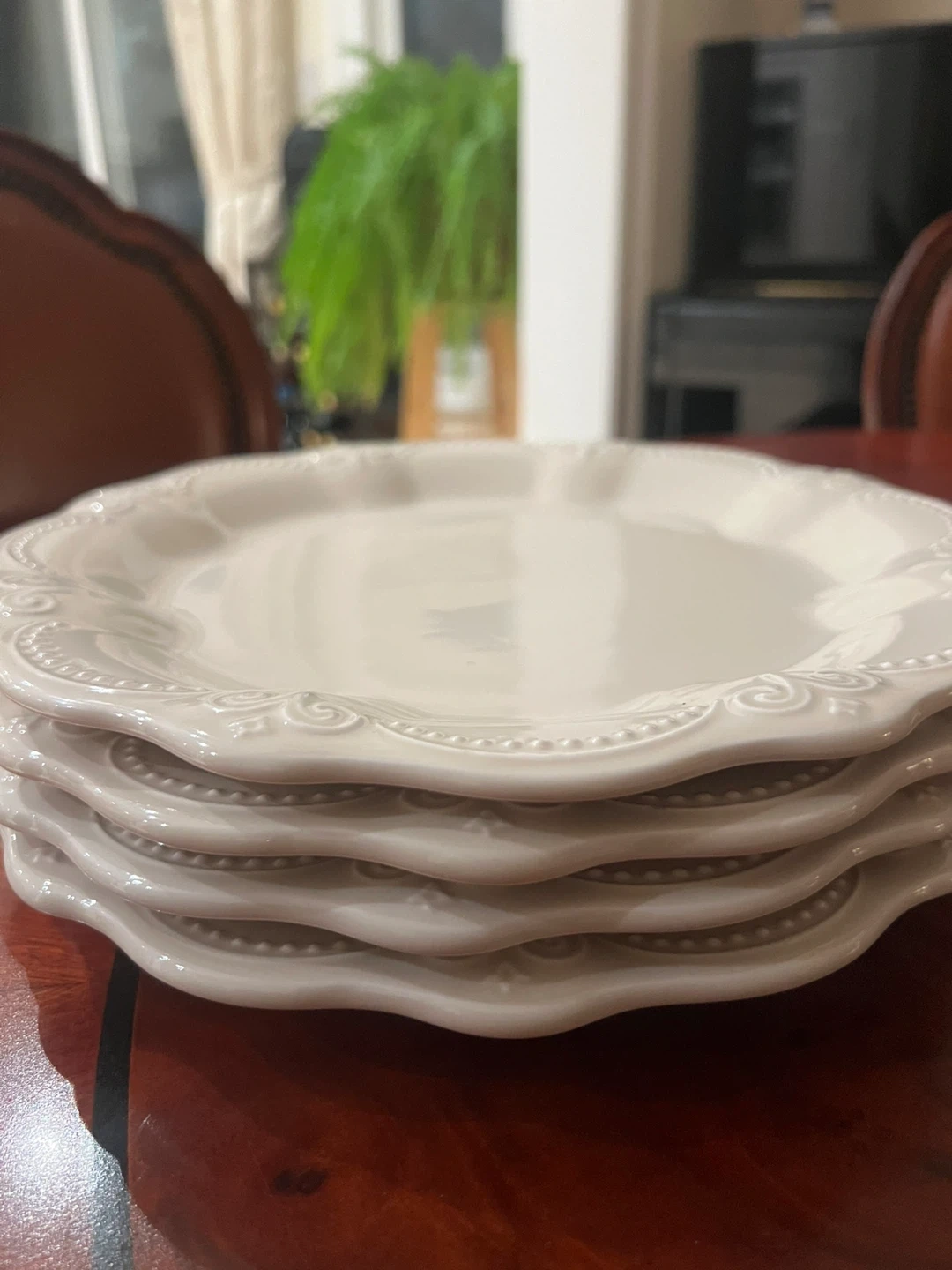 Selling a set of four decorative white plates. They're in great condition and would look lovely in any home. Perfect for adding a touch of elegance to your dining table!