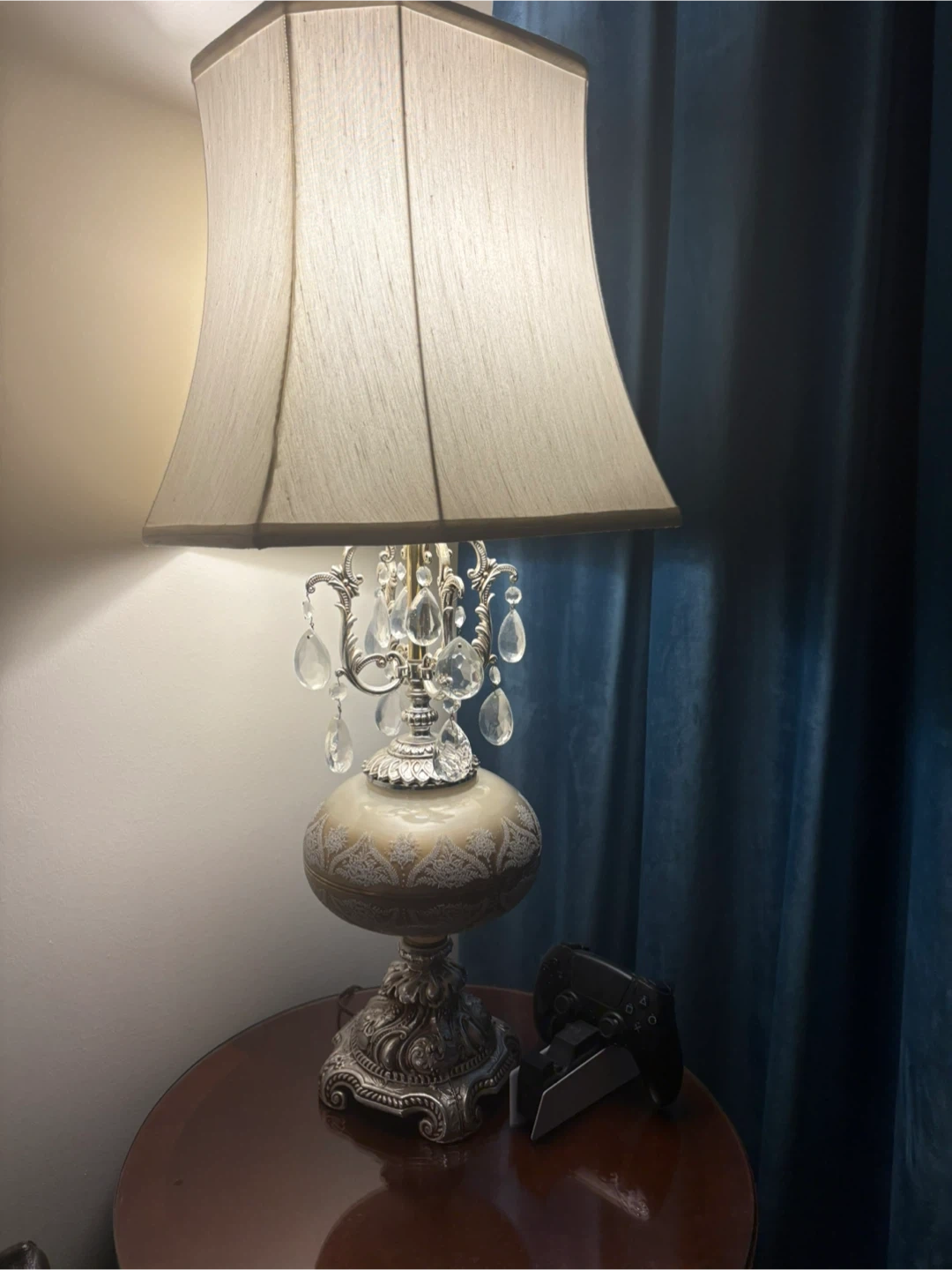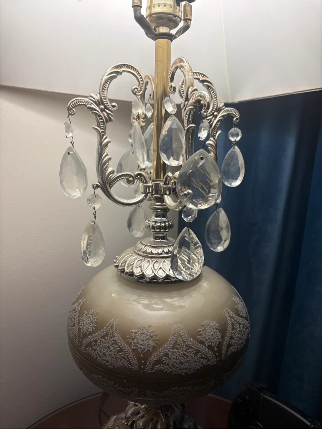 Selling a beautiful vintage-style table lamp with crystal accents! It features an ornate silver-tone design and a classic lampshade. This lamp would add a touch of elegance to any room