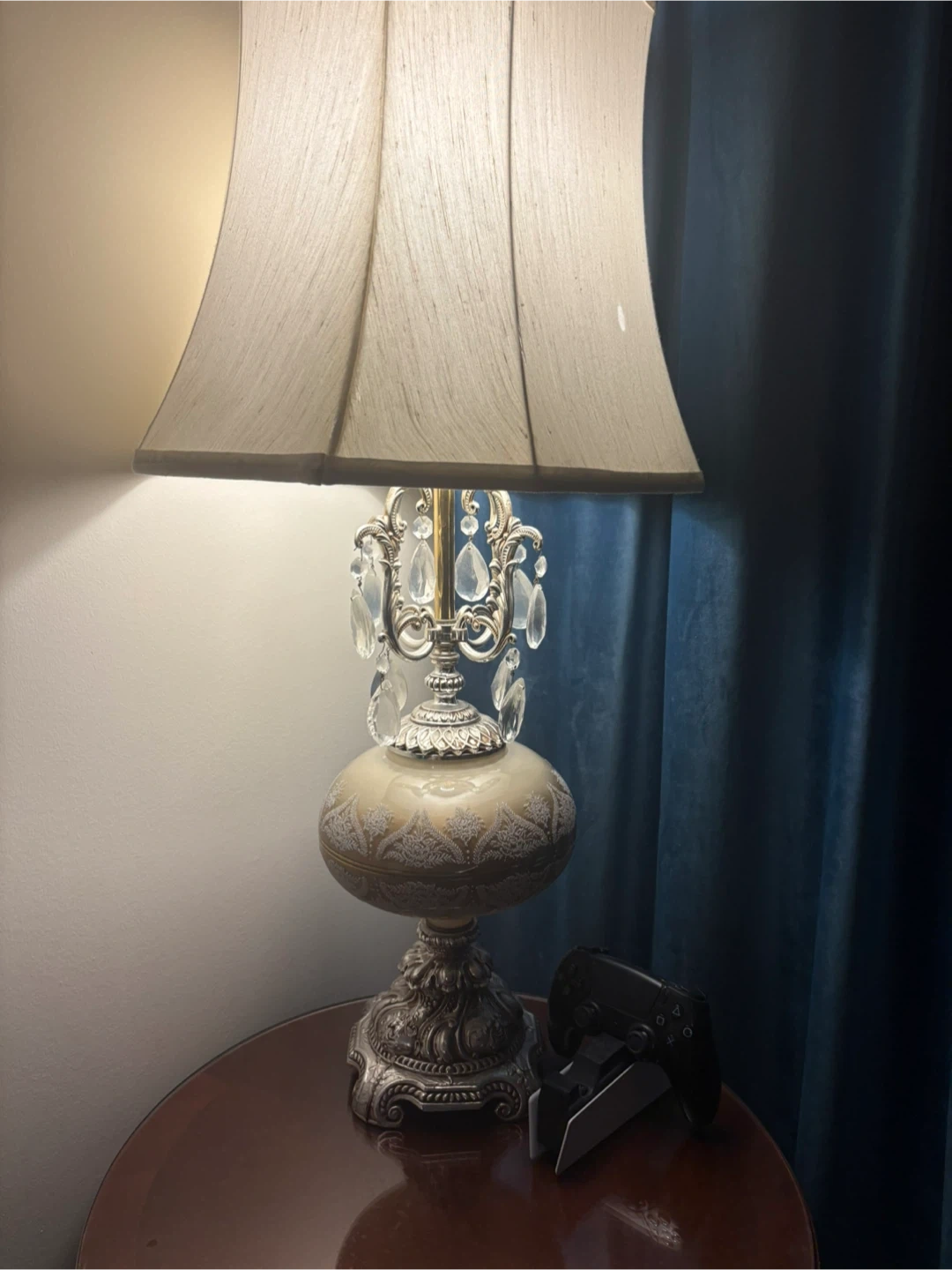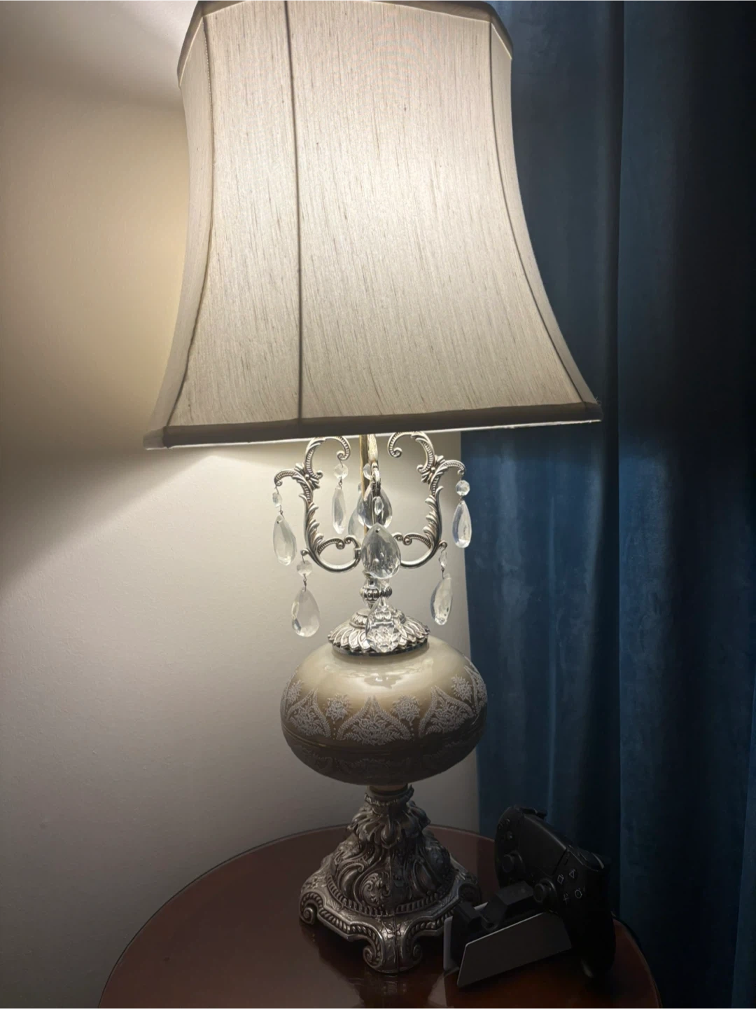 Selling a beautiful vintage-style table lamp with crystal accents! It features an ornate silver-tone design and a classic lampshade. This lamp would add a touch of elegance to any room