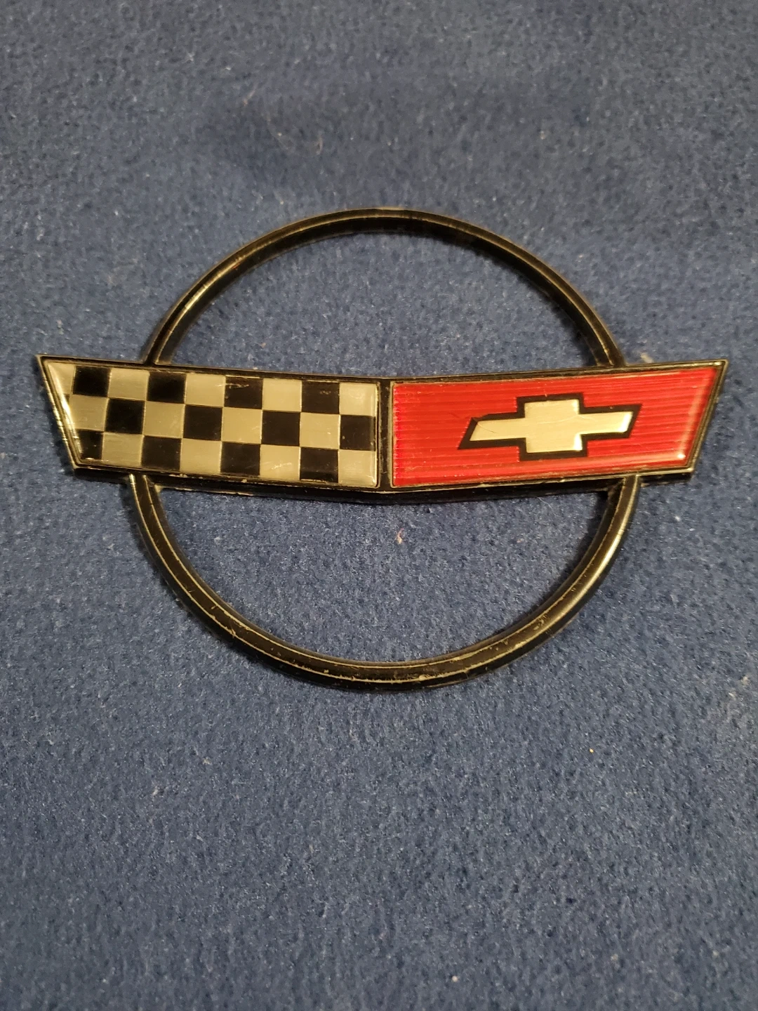 Selling a Chevrolet Corvette emblem! It features the classic checkered flag and red design with the Chevrolet logo. Great for adding a touch of vintage style to your ride