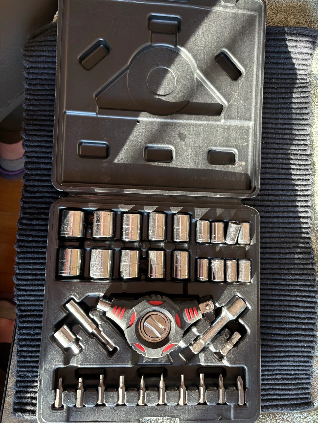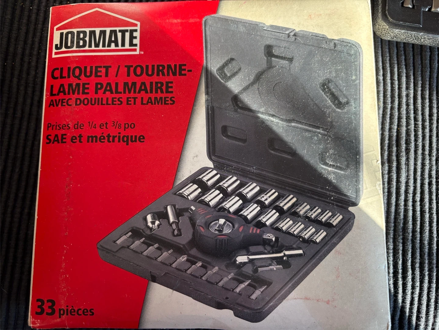 Selling a virtually new Jobmate Palm-Grip Ratchet/Driver set with sockets and bits. It includes 33 pieces. Drive sizes are 1/4 and 3/8 inch. Measurements include both SAE and metric units. Pick up Haysboro SW.
