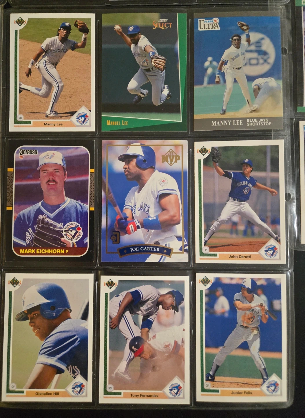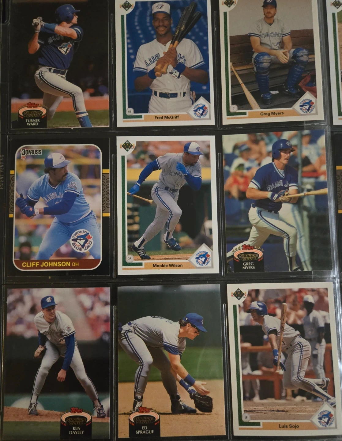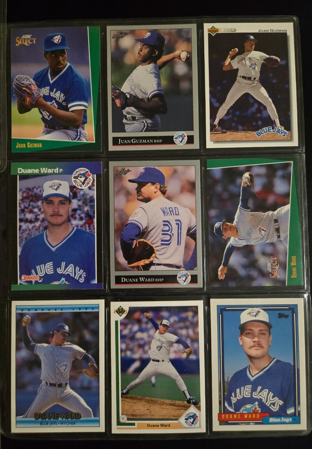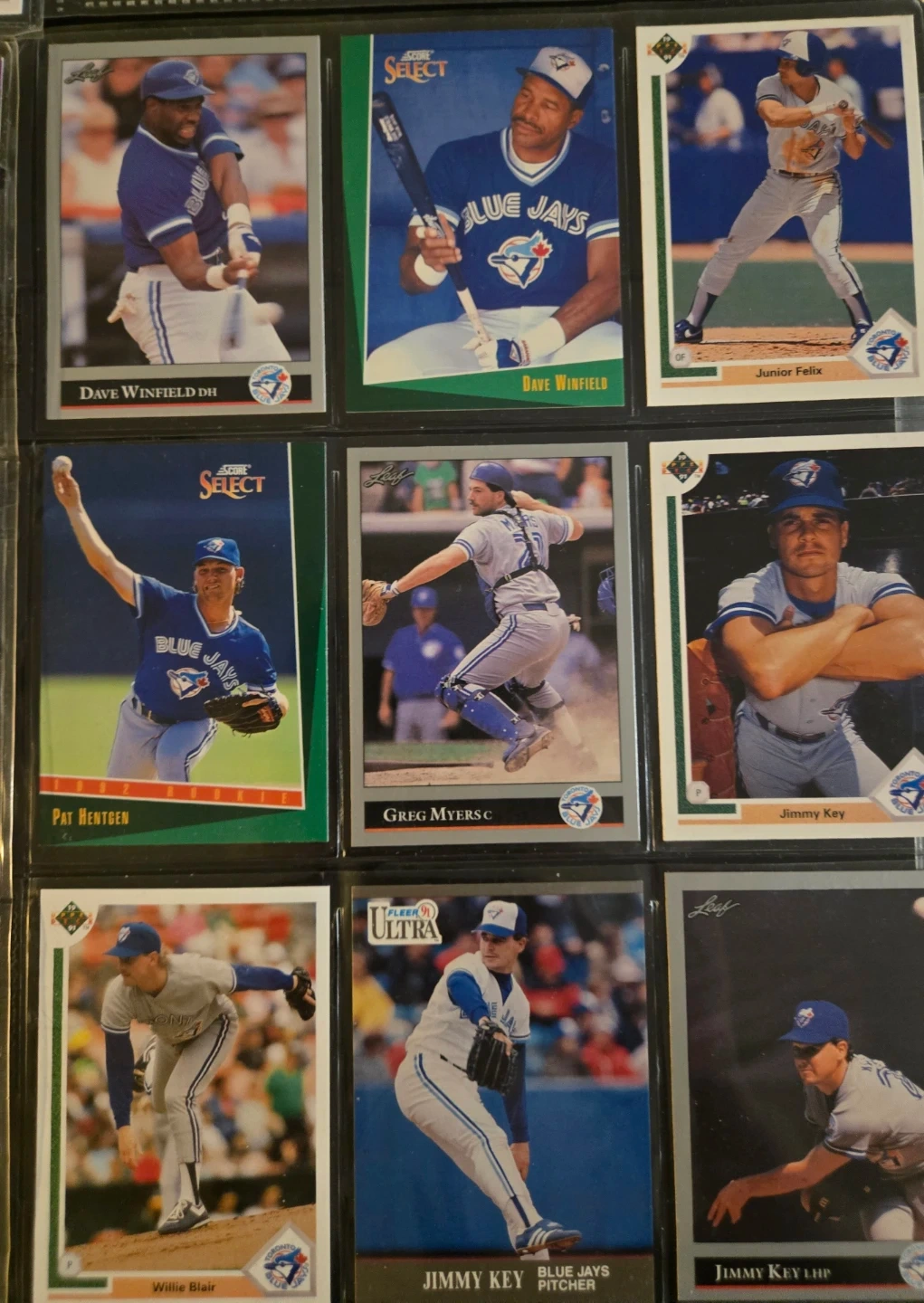 Selling a 90 Card collection of Vintage Late 1980's to early 1990's Blue Jays baseball cards. A variety of players that Include Alomar, Carter, Henke, Winfield, Guzman, Gruber, Borders, Ward, McGriff, Moseby, Morris and Many more. Great for any Blue Jays fan or baseball card collector!