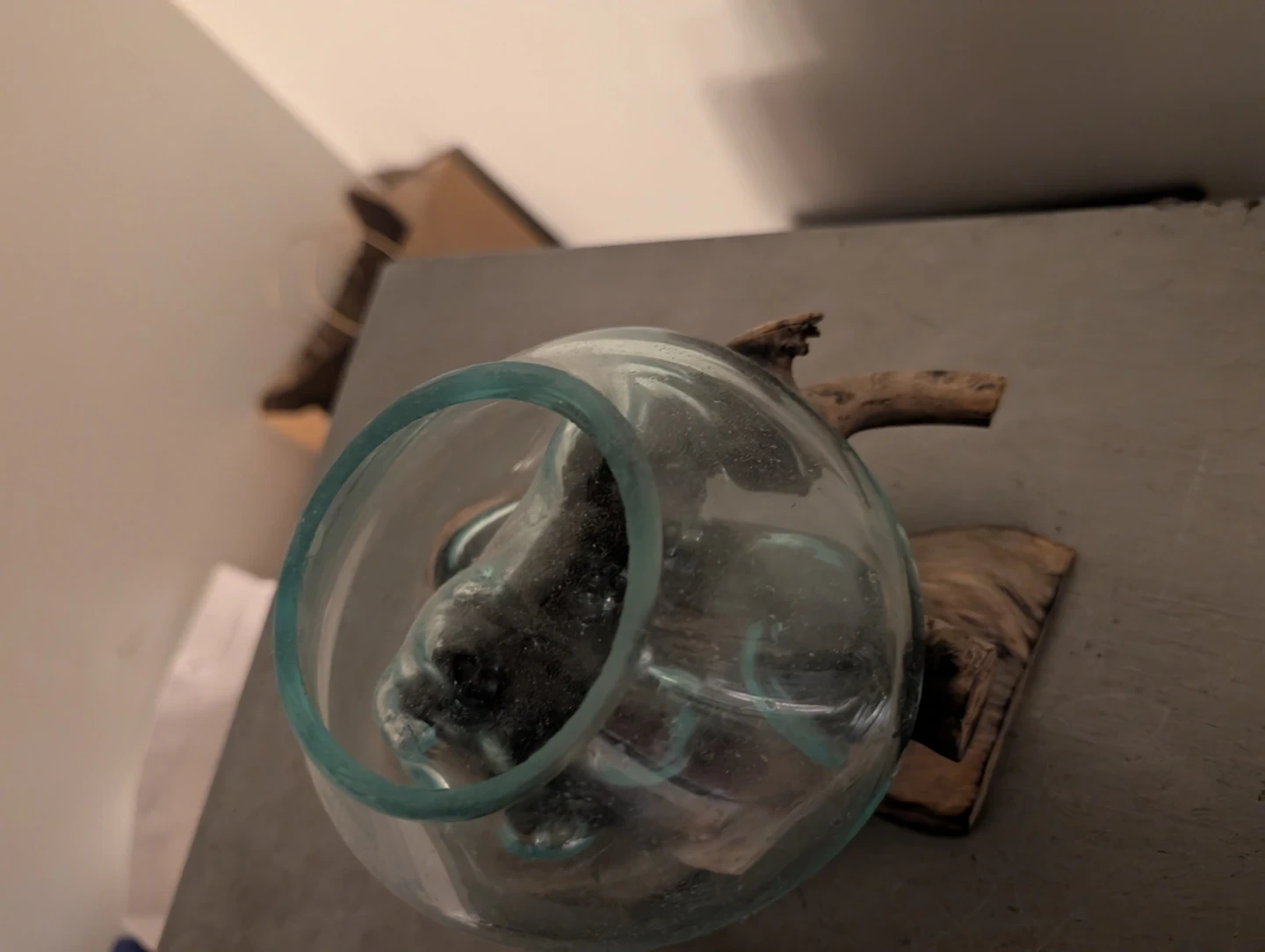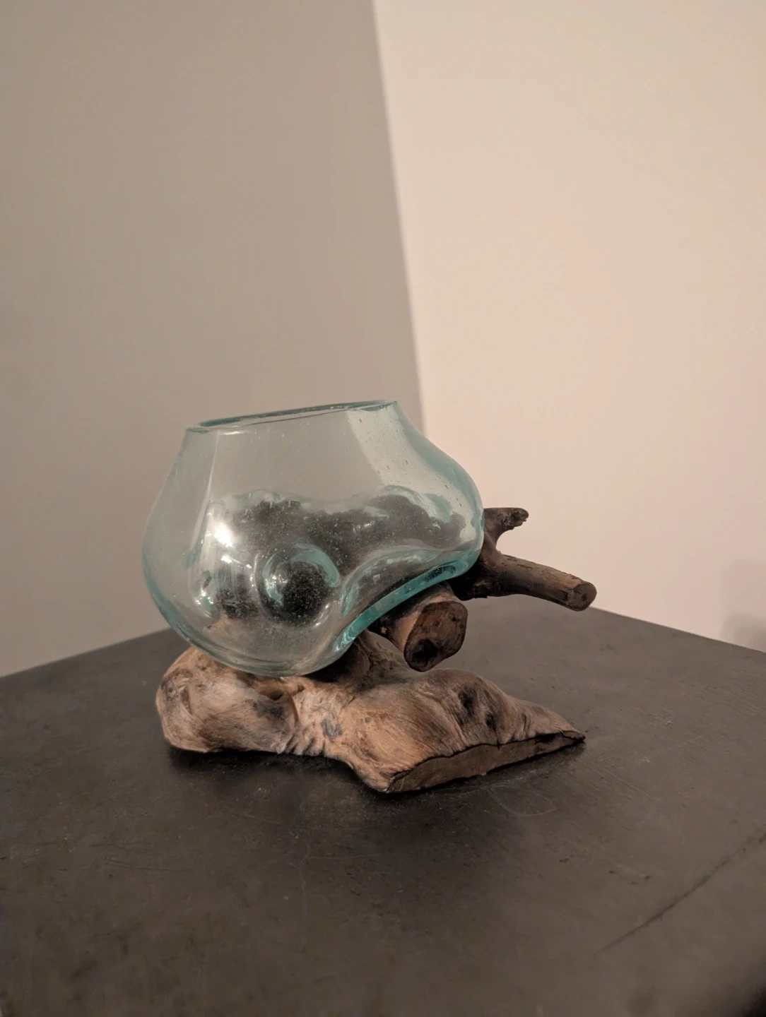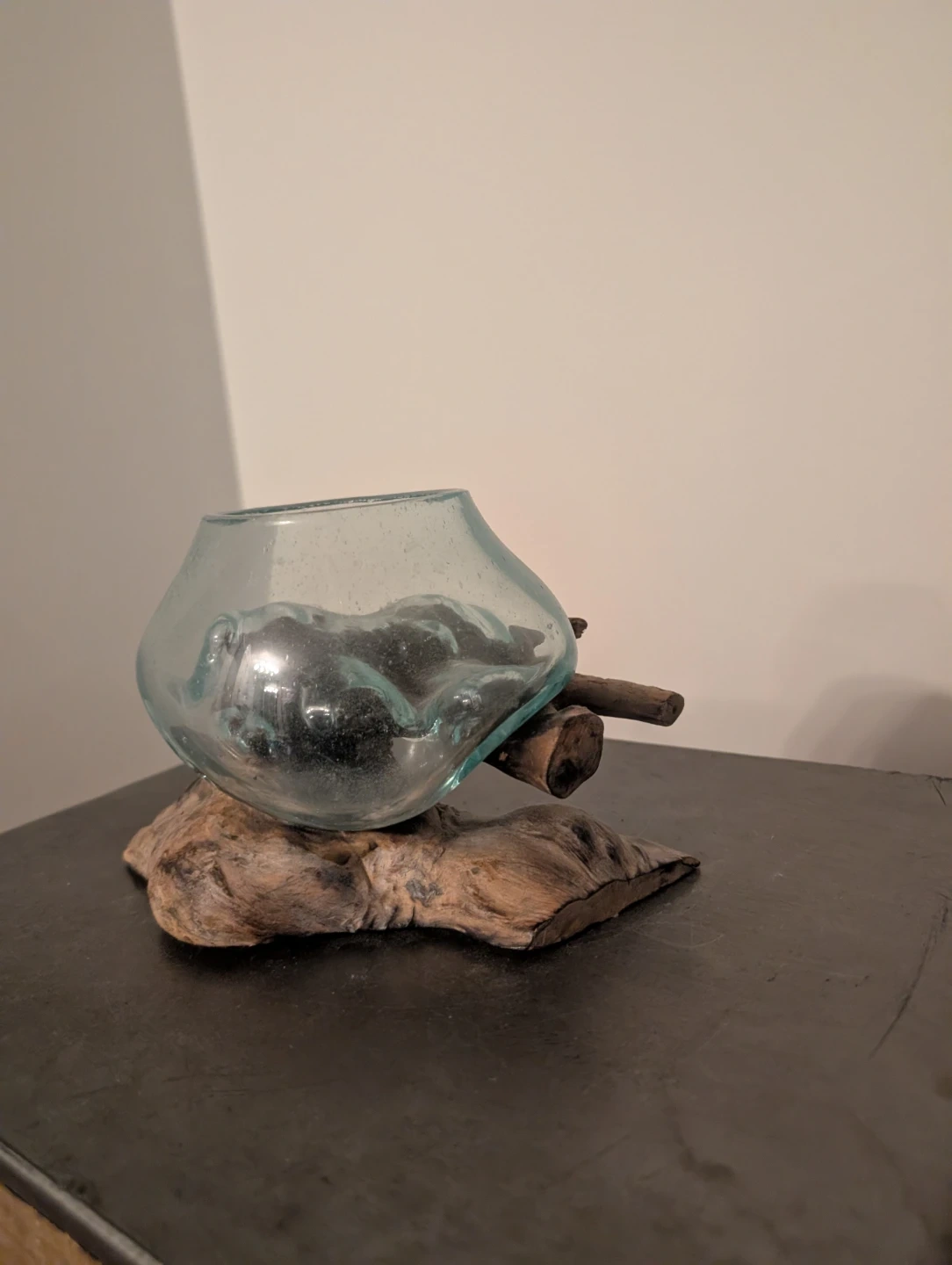 Hand blown Glass Vase with Driftwood Base