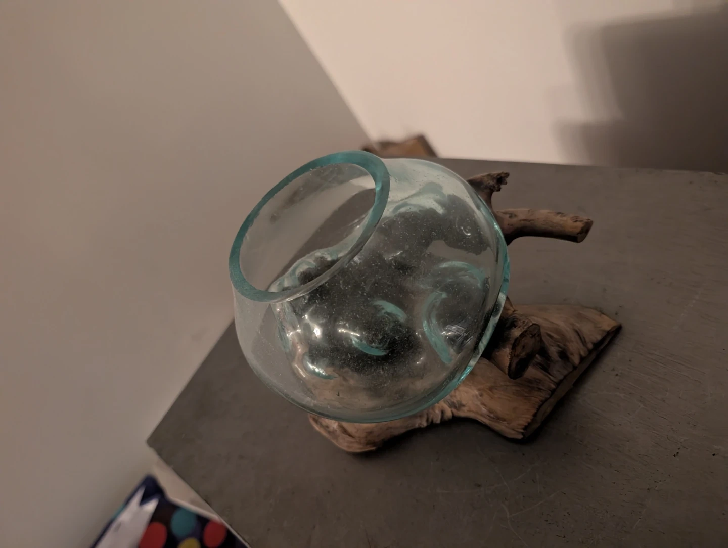 Unique glass vase with a natural driftwood base! It's a beautiful decorative piece that would look great in any room. The glass is in excellent condition, and the driftwood base adds a rustic touch