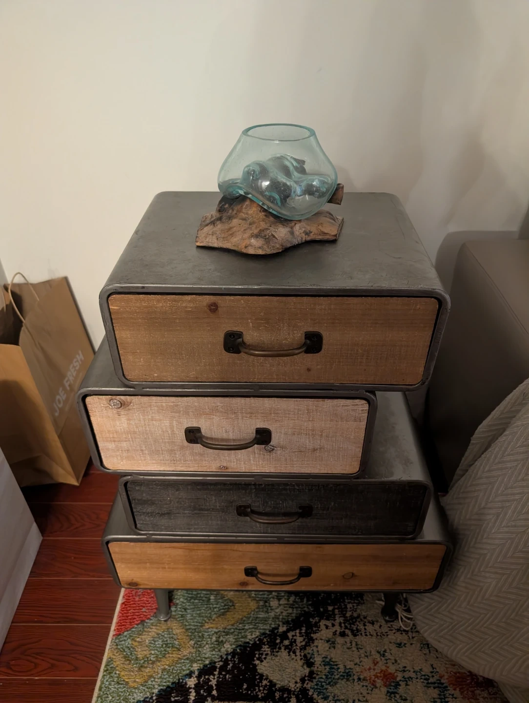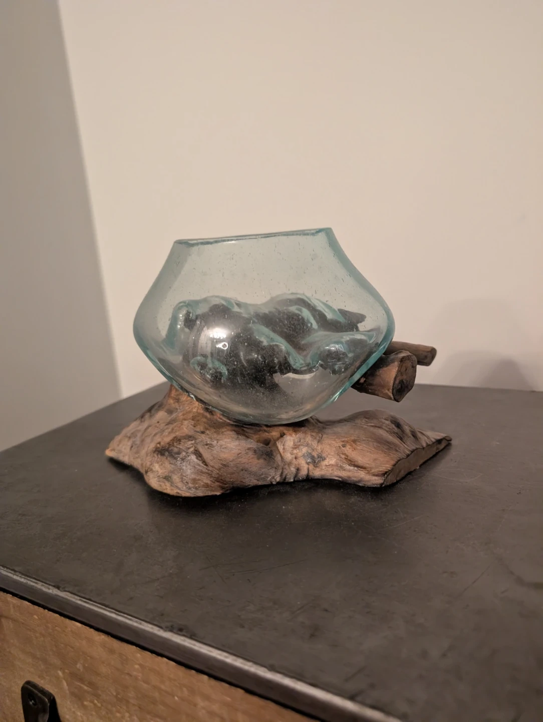 Unique glass vase with a natural driftwood base! It's a beautiful decorative piece that would look great in any room. The glass is in excellent condition, and the driftwood base adds a rustic touch