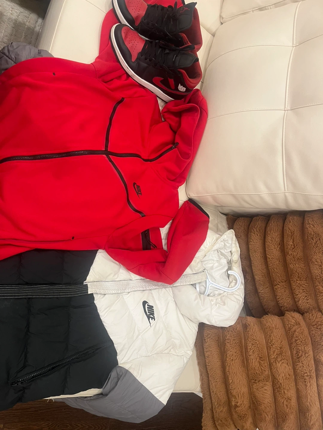 Selling a Nike red tech fleece and a pair of Air Jordan 1s. Both items show signs of wear but are still in good condition. Great for casual wear or sports activities!