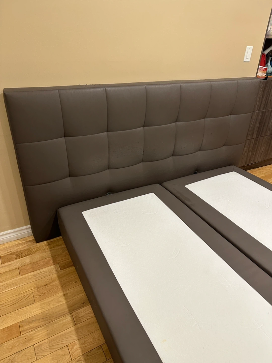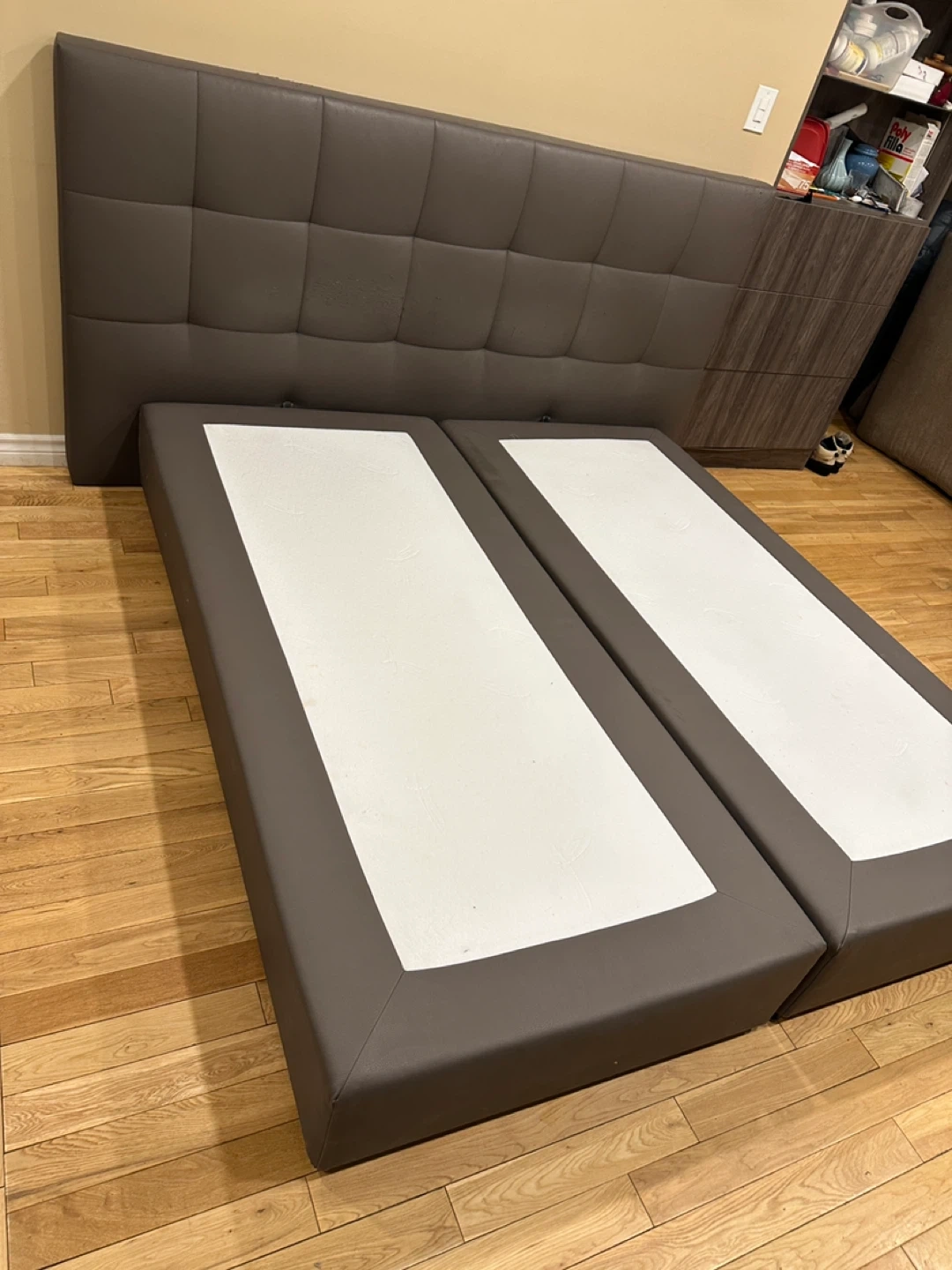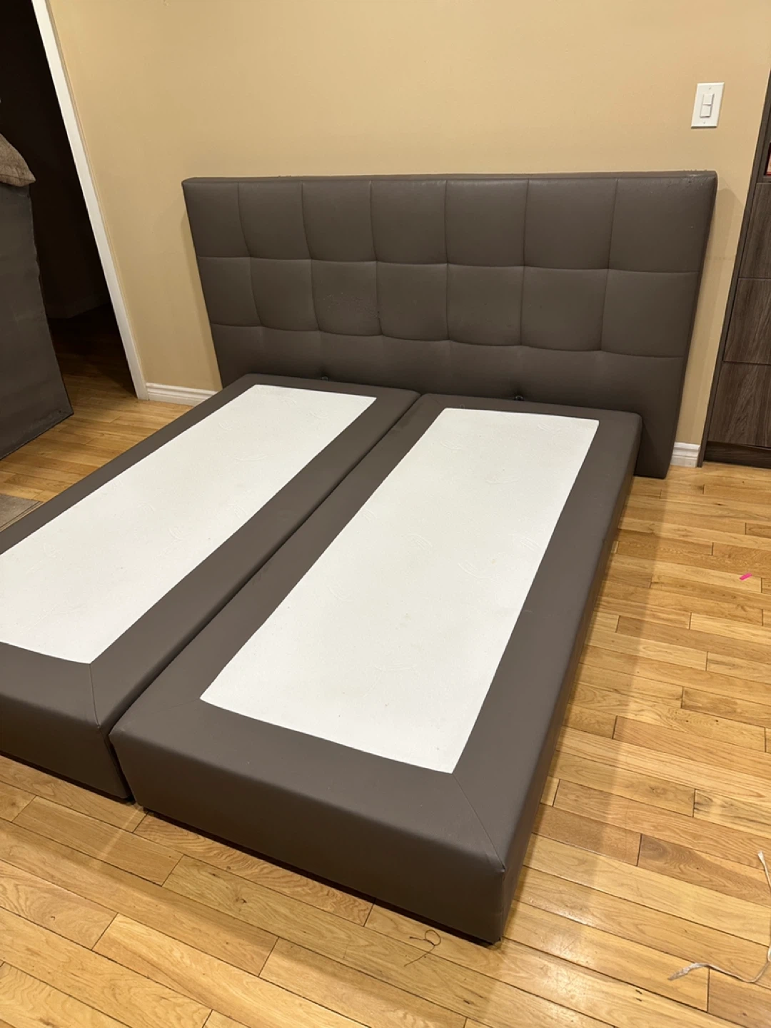 Modern European-style upholstered platform bed with a tall, padded tufted headboard and split base design. Made of faux leather in a sleek neutral grey. Designed to be used without a box spring.