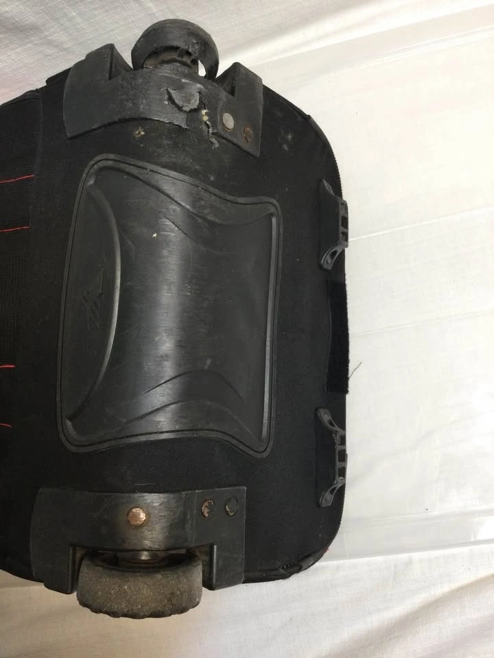 Fair condition. One wheel is still functional, but needs replacement. Could be used as a regular backpack as well.