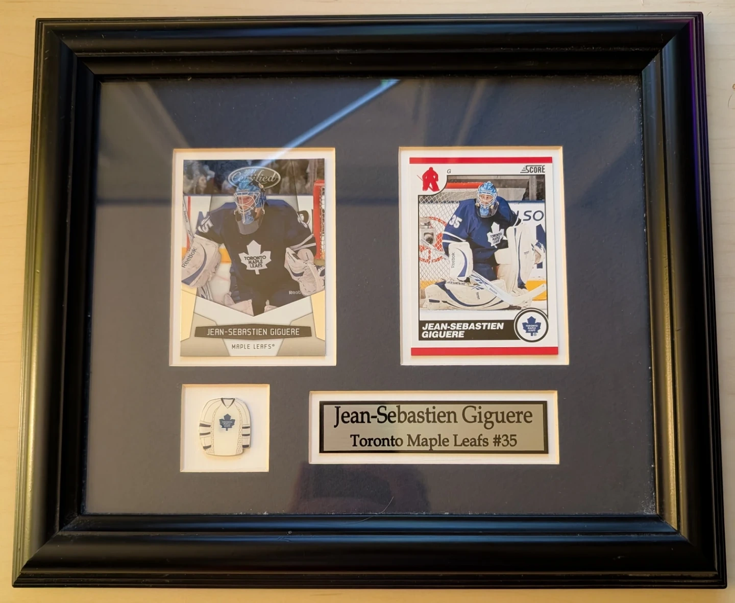 Framed memorabilia featuring Jean-Sebastien Giguere of the Toronto Maple Leafs #35 with two hockey cards and a small jersey pin. Price is $40