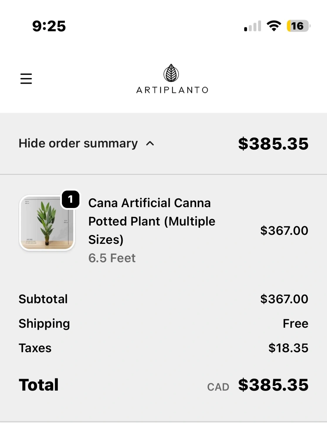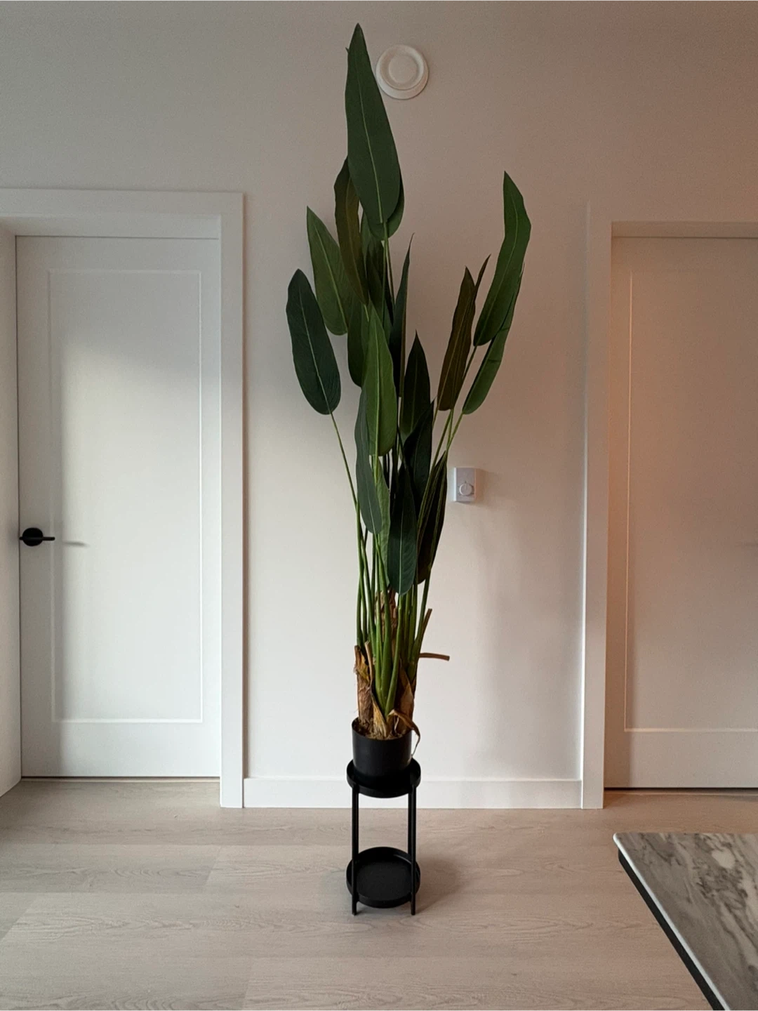 Selling a beautiful 6.5ft Cana artificial plant from Artiplanto. It features lush, large green leaves and a very realistic appearance. It’s a high-quality piece that makes a statement in any room. Price includes the modern black plant stand shown in the photo.