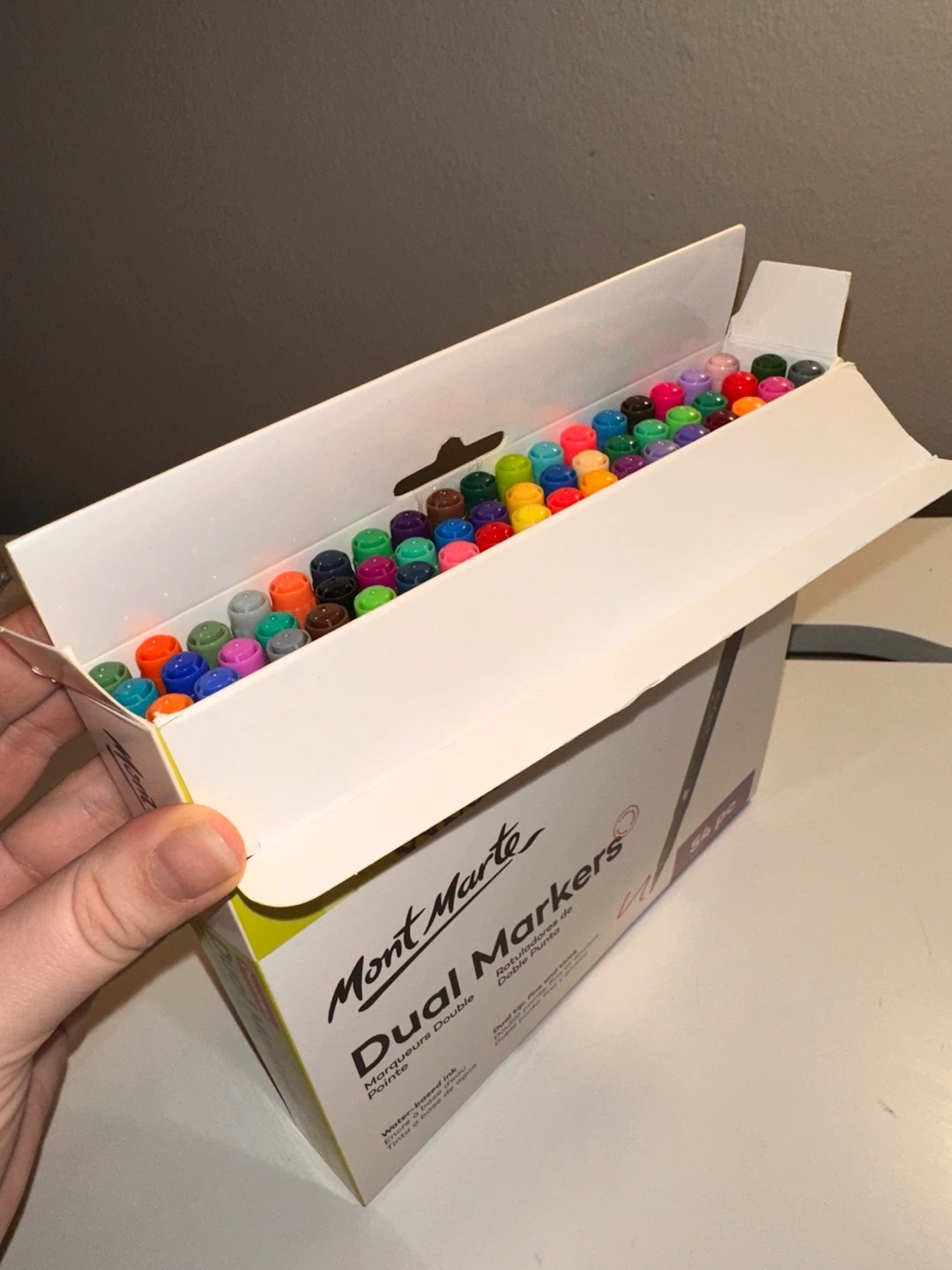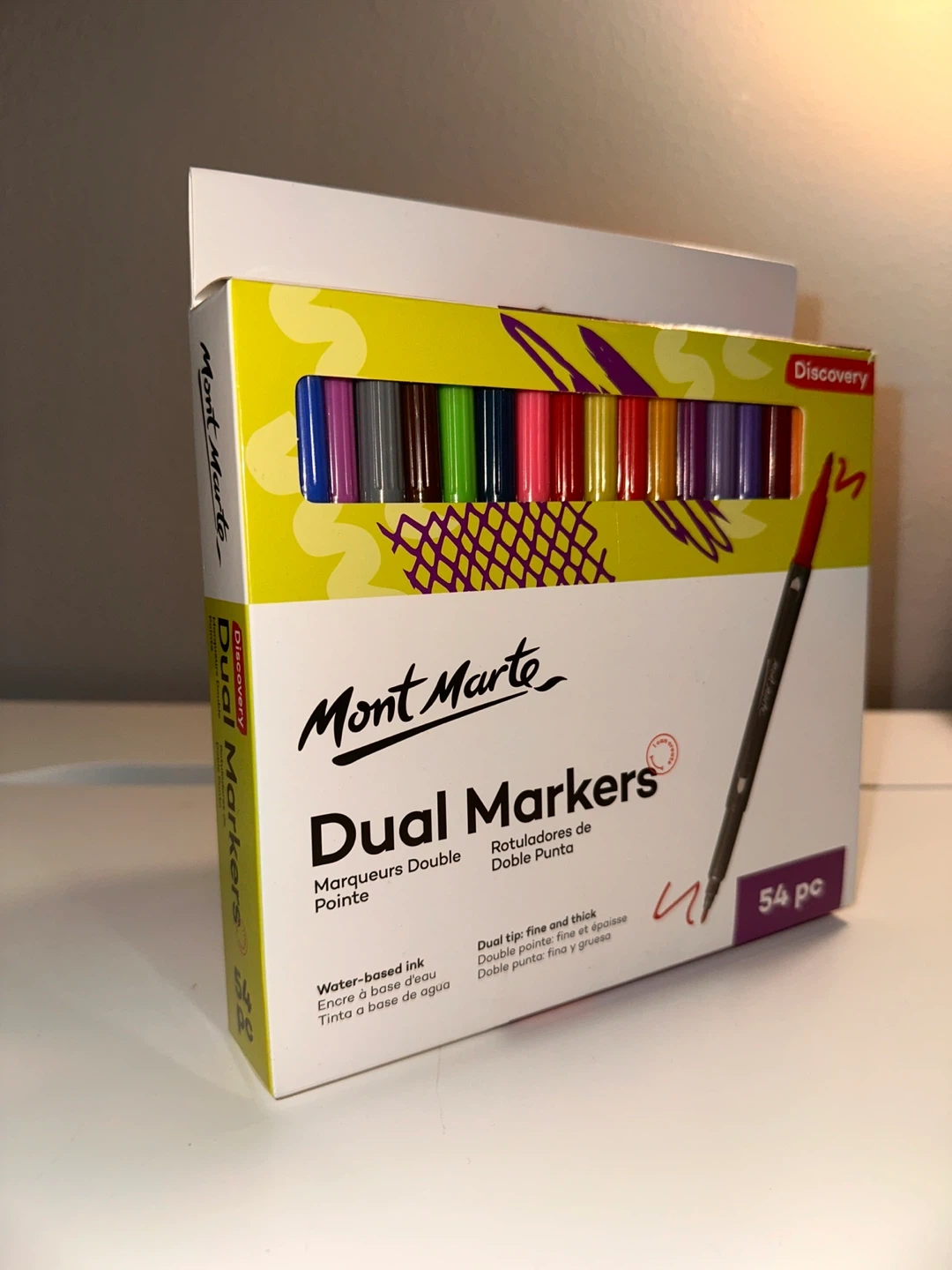 Mont Marte Dual Markers with fine and thick tips, perfect for all your creative projects! This set includes 54 vibrant colours and is water-based