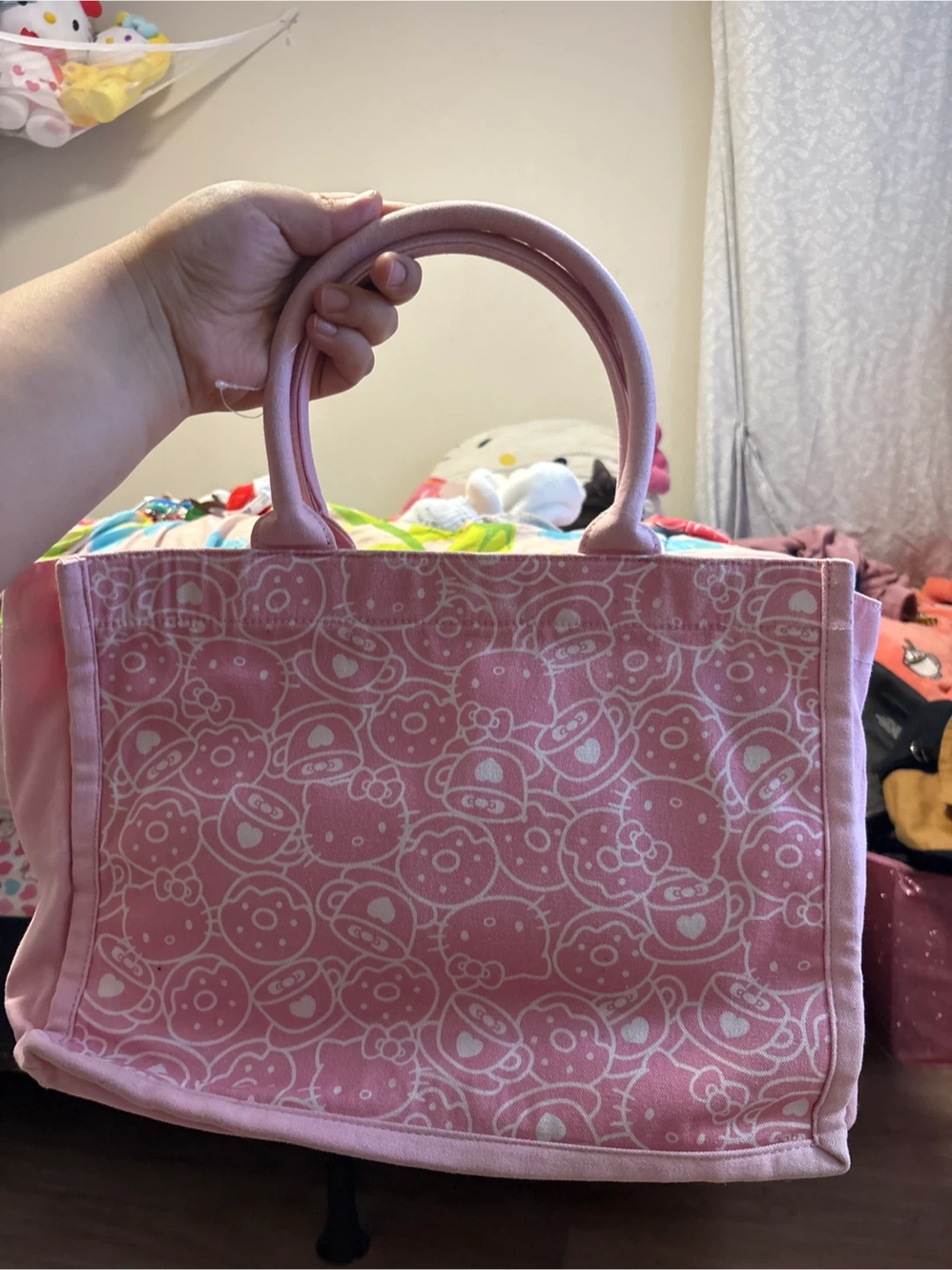 Super cute pink Hello Kitty tote bag! It features an all-over print with Hello Kitty and donut designs. Perfect for carrying your everyday essentials in style