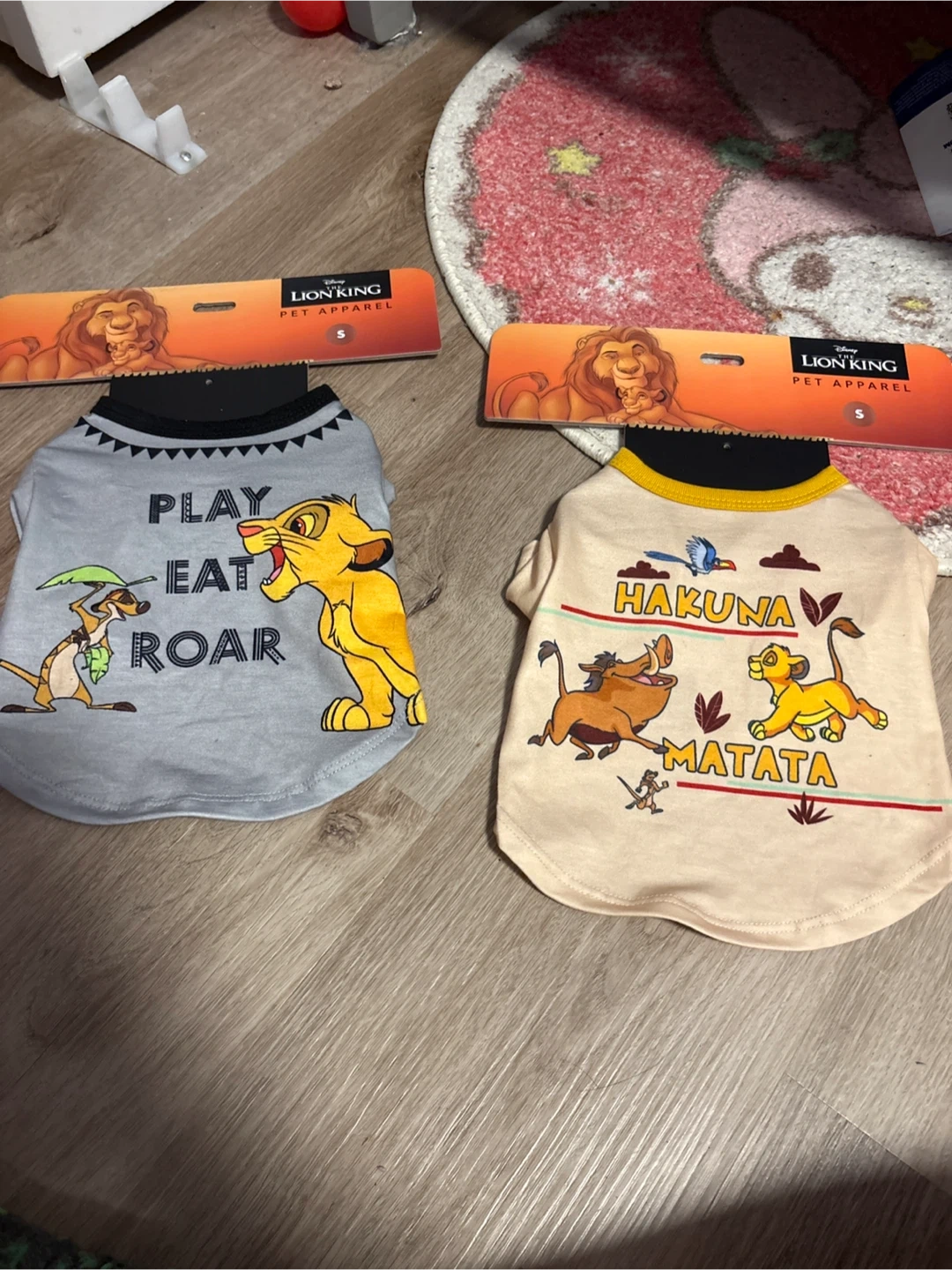 Two adorable Disney Lion King pet shirts! One is grey with "Play Eat Roar" and the other is a light beige with "Hakuna Matata" Both are size small and brand new!