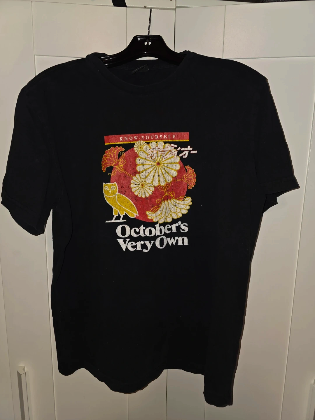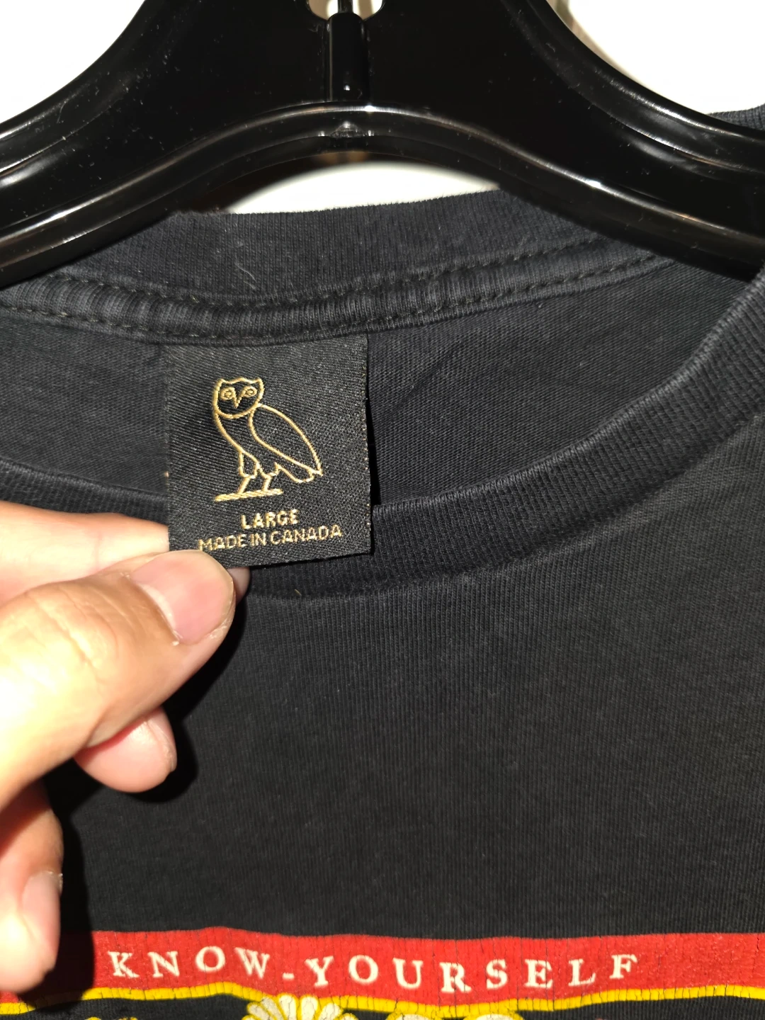 Selling a black October's Very Own (OVO) t-shirt. It's in great condition and features the iconic OVO owl logo with the 'KNOW-YOURSELF' design. The size is Large and it's made in Canada!