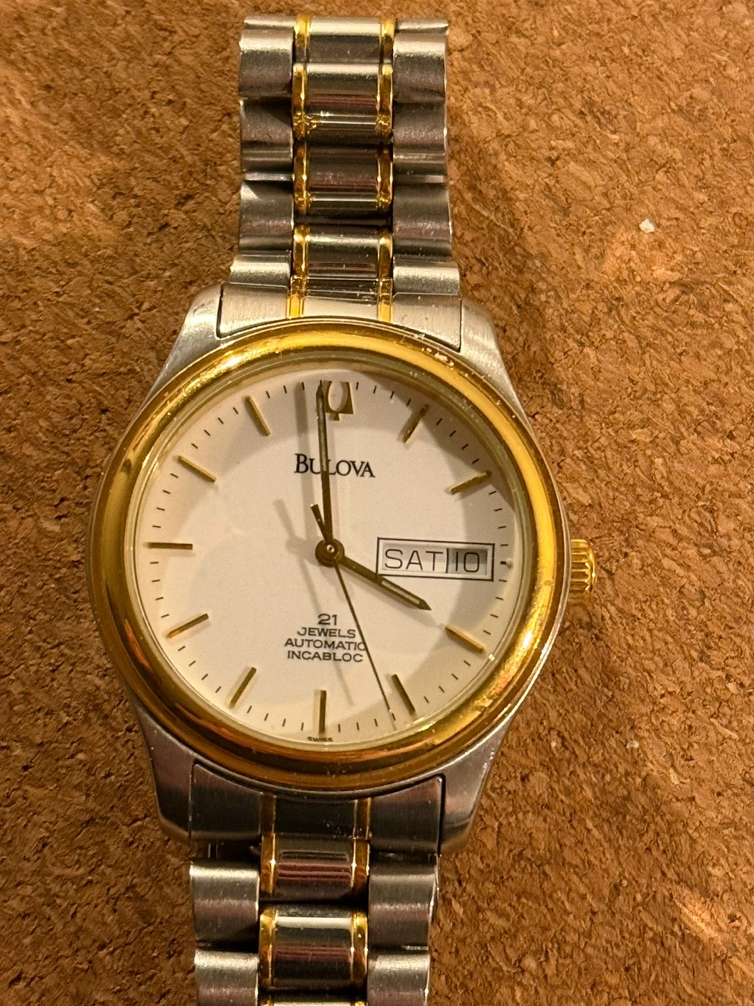 Selling a Bulova automatic watch with a stainless steel band. It features a two-tone design with gold accents. The watch is marked as water-resistant and has 'Since 1875' engraved on the back. It's a classic and stylish timepiece!