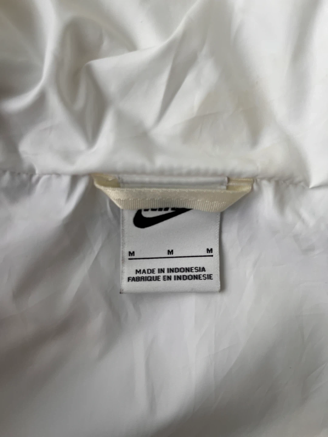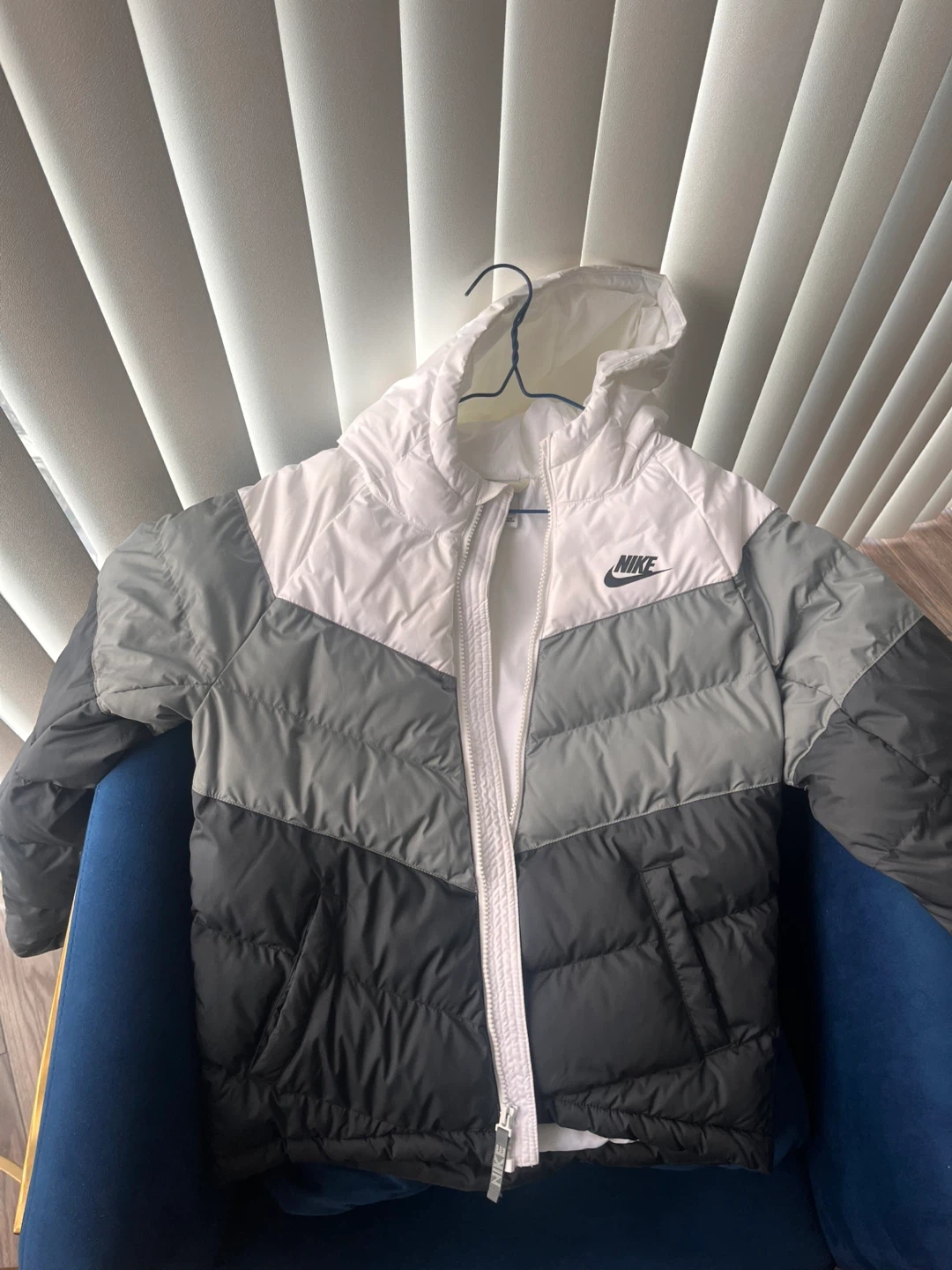 Selling a Nike puffer jacket in excellent condition! It's a stylish grey, white, and black colour block design. Size is M.