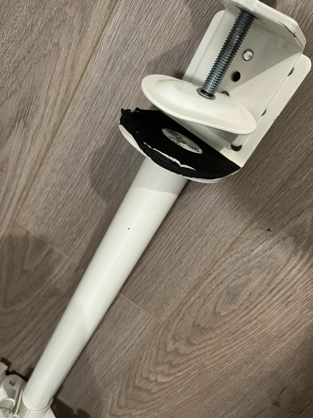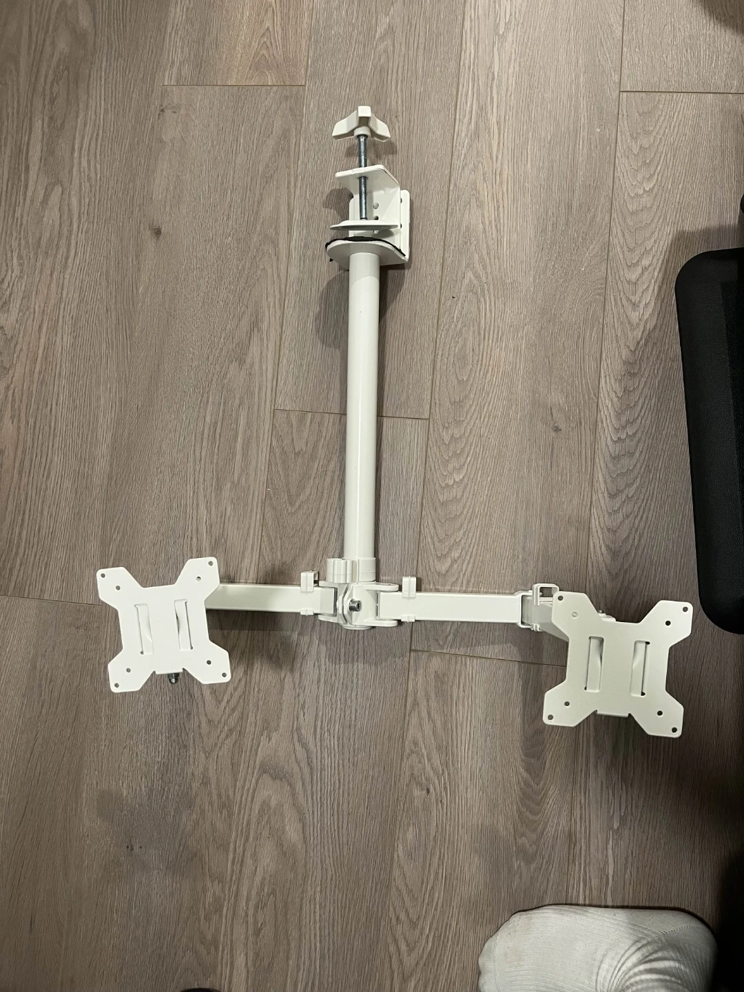 Selling a dual monitor desk mount in white. It's perfect for setting up a dual monitor workstation and saving space on your desk. Please note the condition of the mount in the pictures before purchasing