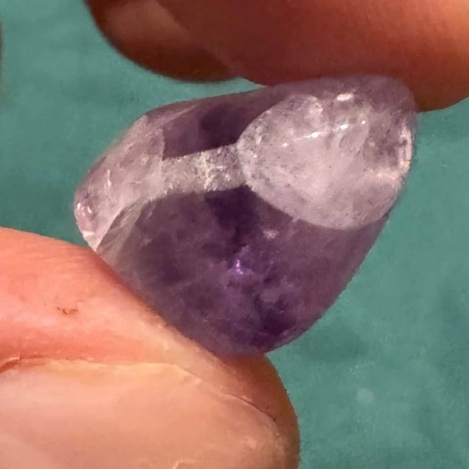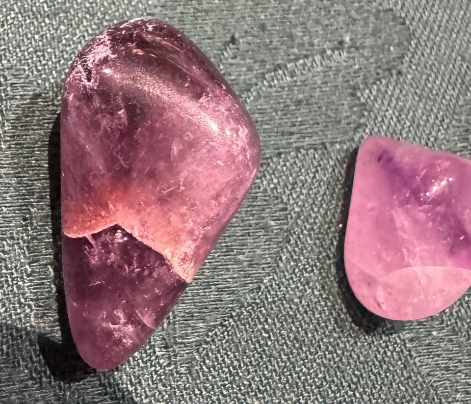 These are genuine amethyst (quartz) with visible purple saturation ranging from soft lavender to deeper violet tones. One piece shows attractive color banding / zoning, and both have a nice glassy luster when caught in the light.