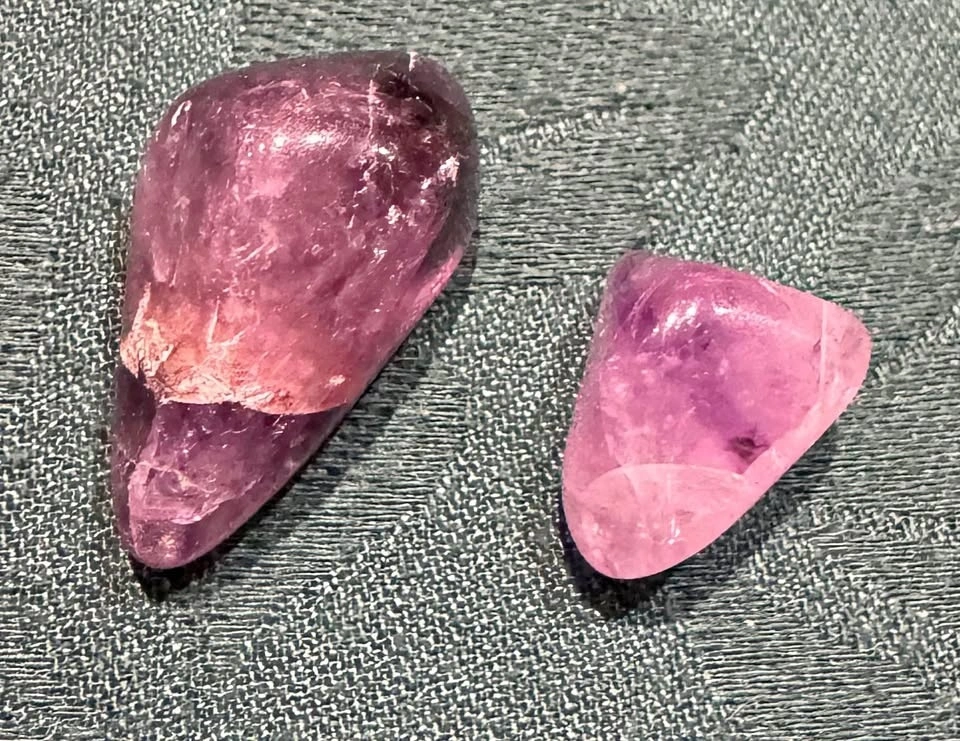 These are genuine amethyst (quartz) with visible purple saturation ranging from soft lavender to deeper violet tones. One piece shows attractive color banding / zoning, and both have a nice glassy luster when caught in the light.