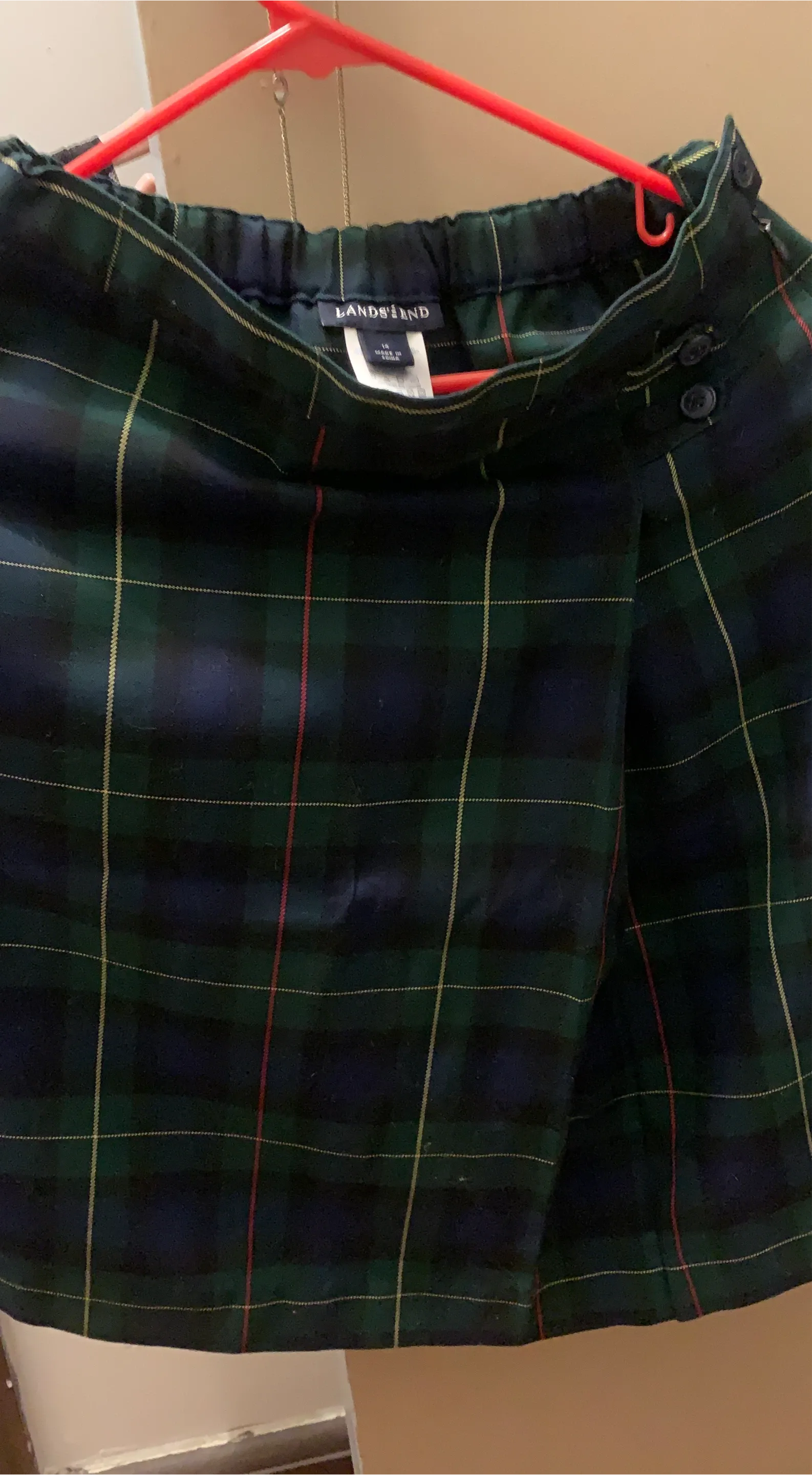 Selling a Lands' End plaid skirt. It's a size 14 and features a classic plaid pattern. Perfect for school or casual wear!
