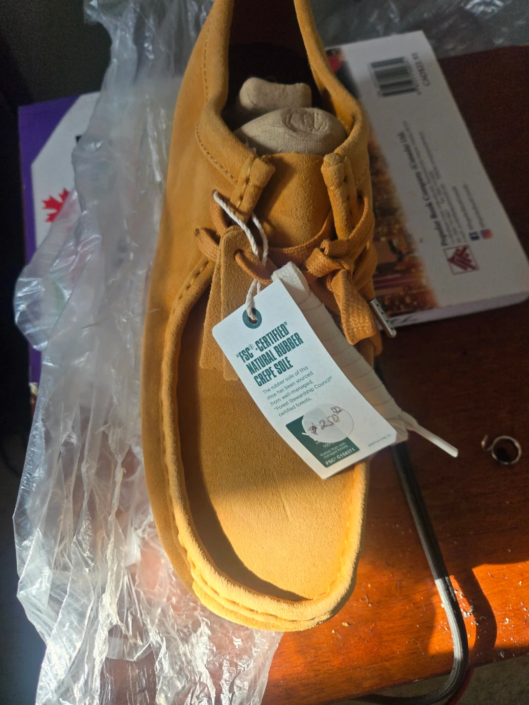 Selling a pair of Clarks Wallabee shoes in size 10.5. They feature a natural rubber crepe sole. The tag indicates they are FSC-certified.