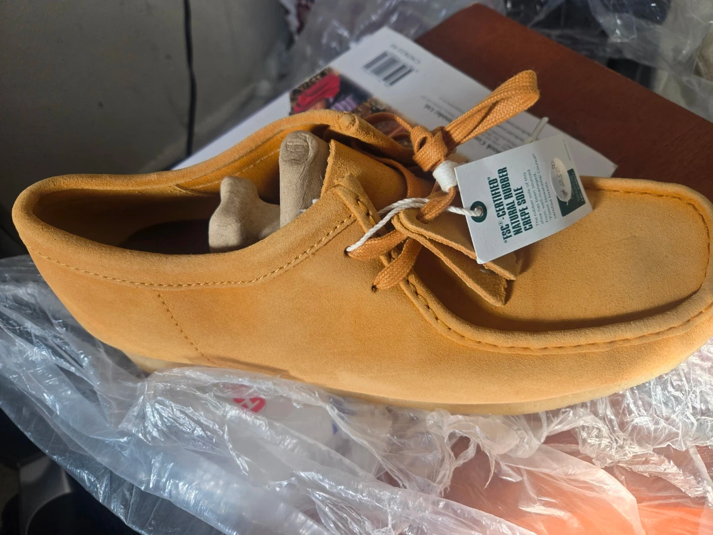 Selling a pair of Clarks Wallabee shoes in size 10.5. They feature a natural rubber crepe sole. The tag indicates they are FSC-certified.