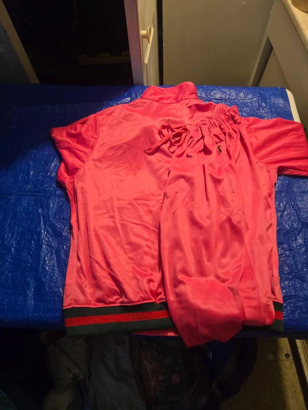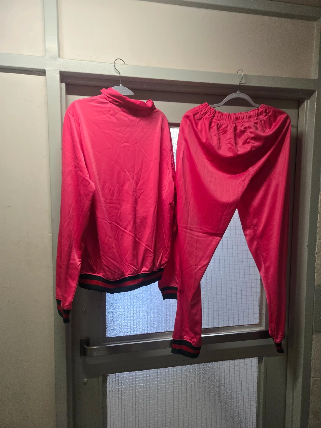 Selling a pink tracksuit set. It features a jacket and matching pants. The jacket has a zipper and the pants have an elastic waistband. Great for casual wear or workouts!